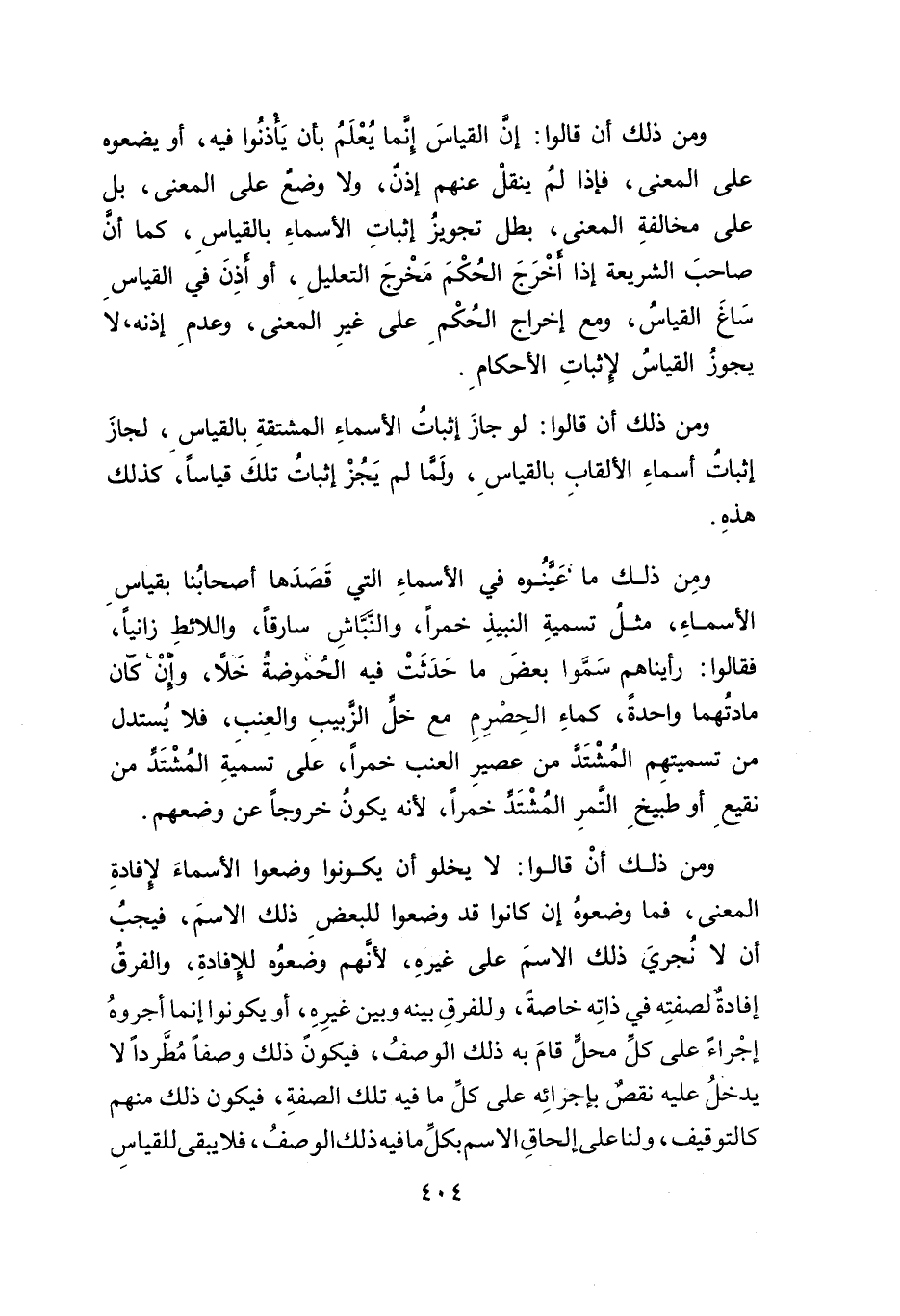 ومِن ذلك ما عَيَّنُوه في الأسماءِ التي قَصَدَها أصحابُنا بقياسِ الأسماءِ، مثلُ تسميةِ النبيذِ خمراً، والنَّبَّاشِ سارقاً، واللائطِ زانياً، فقالوا: رأيناهم سَموا بعضَ ما حَدَثَتْ فيه الحموضةُ خَلاً، وإْنْ كان مادتُهما واحدةً، كماءِ الحِصْرِمِ مع خل الزبيب والعِنب، فلا يُستدل من تسميتهِم المُشْتَد من عصيرِ العنب خمراً، عَلى تسمَيةِ المُشْتَد من نقيعِ أو طبيخِ التمرِ المُشْتَدِّ خمراً، لأنه يكونُ خروجاً عن وضعهم.