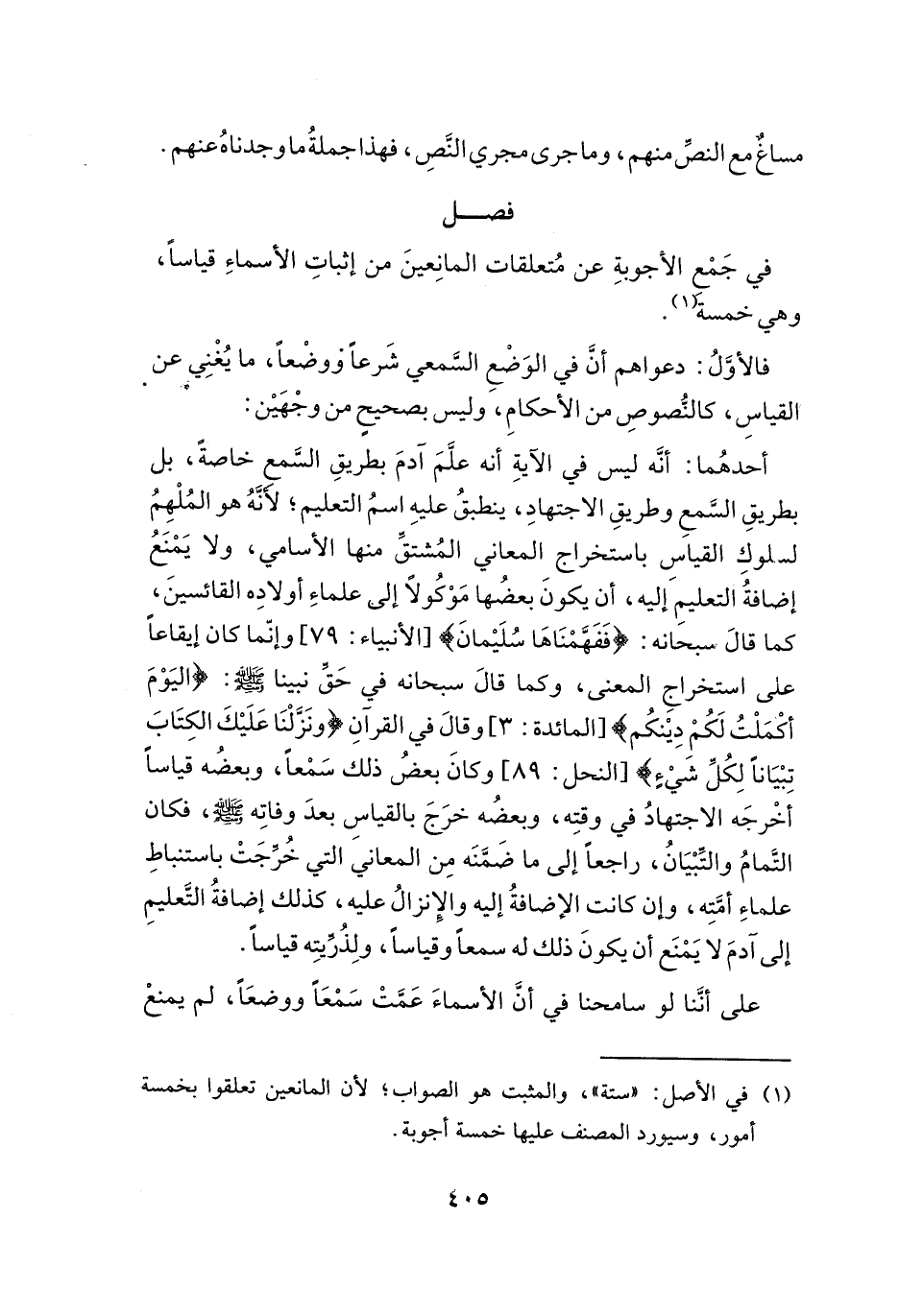 (١) في الأصل: "ستة"، والمثبت هو الصواب؛ لأن المانعين تعلقوا بخمسة أمور، وسيورد المصنف عليها خمسة أجوبة.