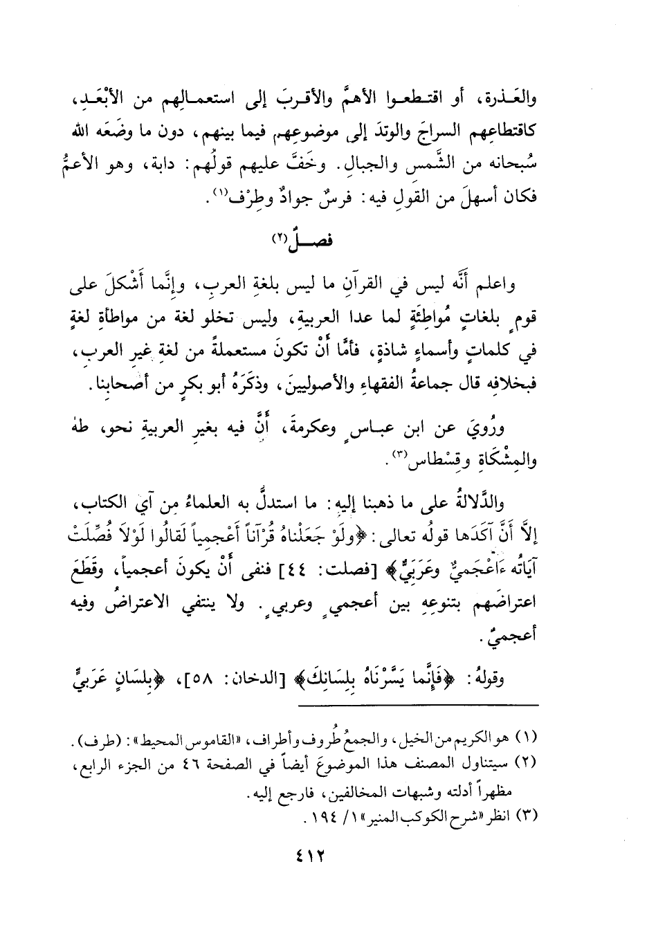 واعلم أَنّه ليس في القرآنِ ما ليس بلغةِ العربِ، وإِنَّما أَشْكلَ على قوم بلغاتٍ مُواطِئَةٍ لما عدا العربيةِ، وليس تخلو لغة من مواطأةِ لغةٍ في كلمات وأسماءٍ شاذةٍ، فأمَّا انْ تكونَ مستعملةً من لغةِ غيرِ العرب، فبخلافِه قال جماعةُ الفقهاءِ والأصوليينَ، وذكَرَهُ أبو بكرٍ من أصحابِنا.