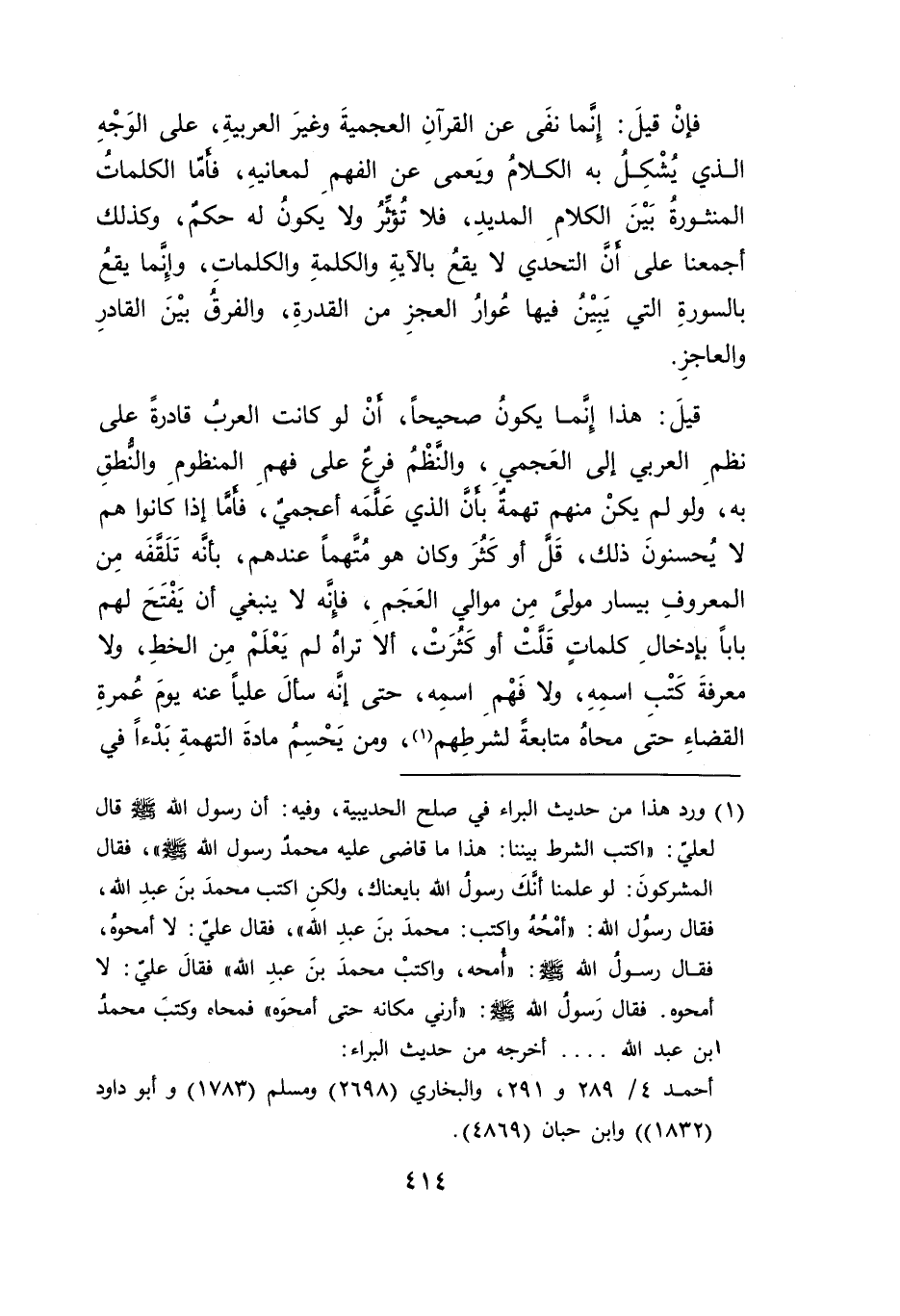 قيلَ: هذا إِنَّما يكونُ صحيحاً، أنْ لو كانت العربُ قادرةً على نظمِ العربي إلى العَجميِ، والنَظْمُ فرعٌ على فهمِ المنظوم والنطقِ به، ولو لم يكنْ منهم تهمةٌ بأنَّ الذي عَلمَه أعجمى، فأمَّا إذا كَانوا هم لا يُحسنونَ ذلك، قَل أو كَثُرَ وكان هو مُتَّهماً عندهم، بأنه تَلَقَّفَه مِن المعروفِ بيسار مولىً مِن موالي العَجَمِ، فإِنَّه لا ينبغي أن يَفْتَحَ لهم باباً بإدخالِ كلماتٍ قَلتْ أو كَثُرَتْ، ألا تراهُ لم يَعْلَمْ مِن الخطِ، ولا معرفةَ كَتْبِ اسمِهِ، ولا فَهْمِ اسمِه، حتى إنَّه سألَ علياً عنه يومَ عُمرةِ القضاءِ حتى محاهُ متابعةً لشرطِهم (١)، ومن يَحْسِمُ مادةَ التهمةِ بَدْءاً في