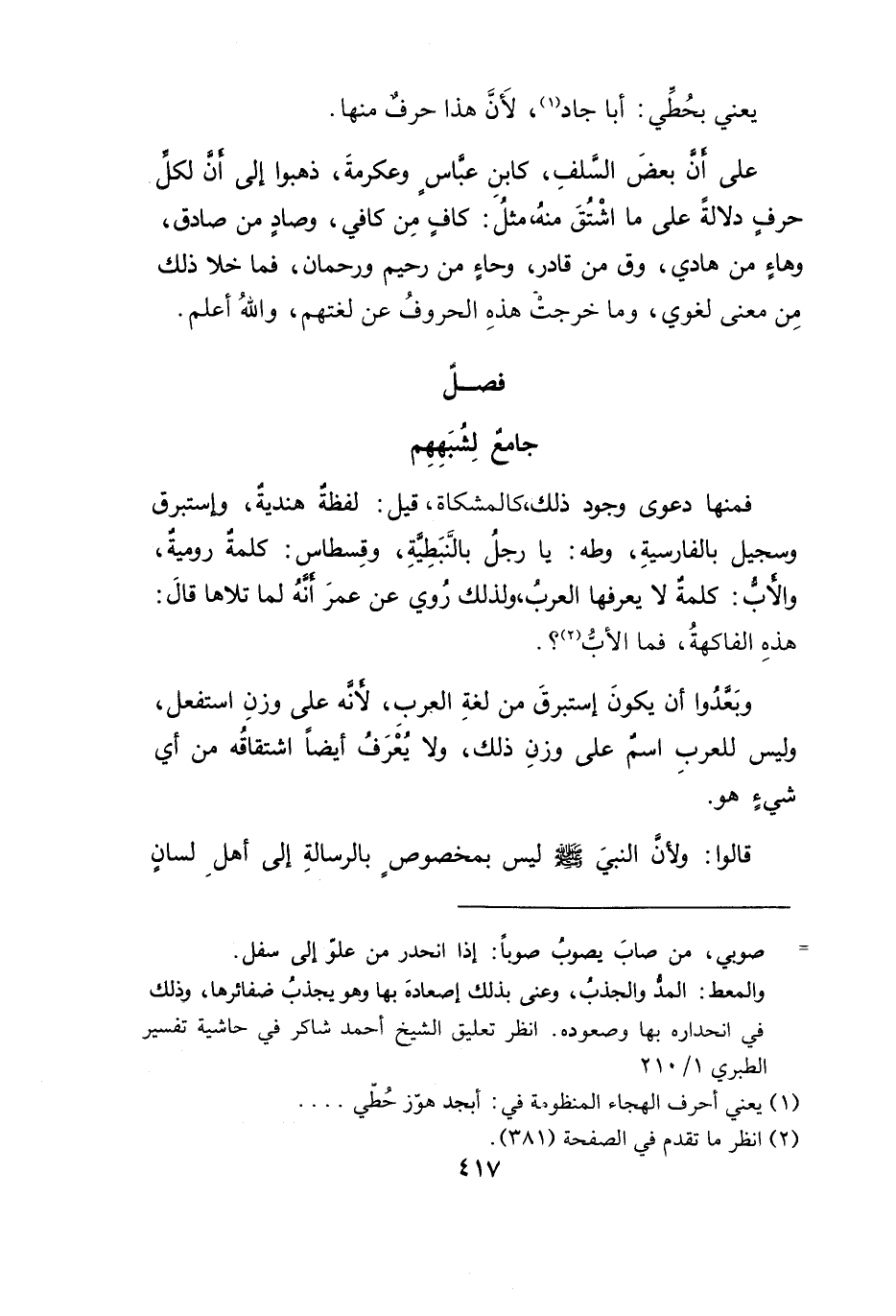 فمنها دعوى وجود ذلك، كالمشكاة، قيل: لفظةٌ هنديةٌ، واستبرق وسجيل بالفارسيةِ، وطه: يا رجلُ بالنَّبَطِيةِ، وقِسطاس: كلمةٌ روميةٌ، والأب: كلمةٌ لا يعرفها العرب، ولذلك رُوي عن عمرَ أنَّهُ لما تلاها قالَ: هذهِ الفاكهةُ، فما الأب (٢)؟.