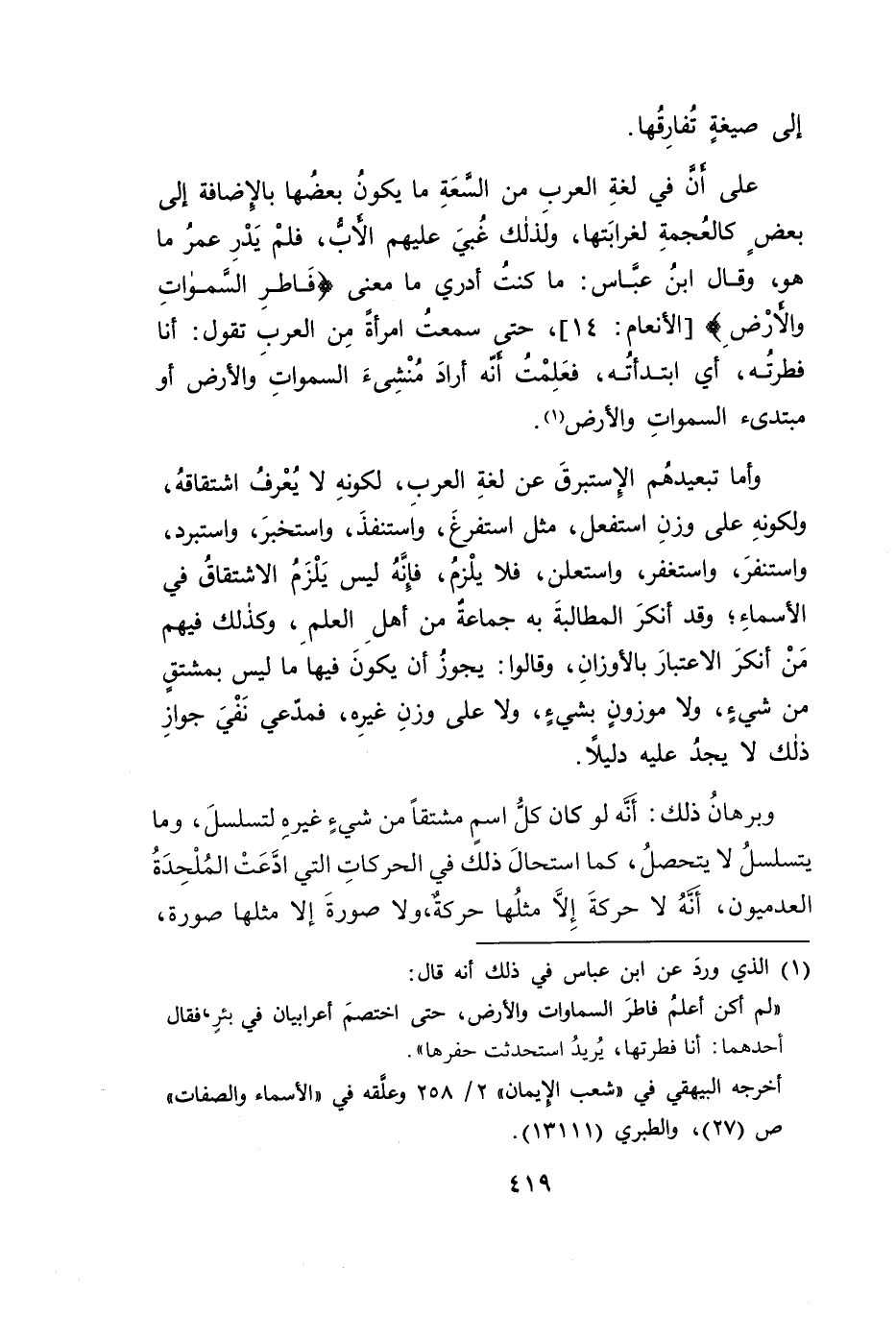 وأما تبعيدهُم الإِستبرقَ عن لغةِ العرب، لكونهِ لا يُعْرفُ اشتقاقهُ، ولكونهِ على وزنِ استفعل، مثل استفرغَ، واَستنفذَ، واستخبرَ، واستبرد، واستنفرَ، واستغفر، واستعلن، فلا يلْزمُ، فإِنَهُ ليس يَلْزَمُ الاشتقاقُ في الأسماءِ؛ وقد أنكرَ المطالبةَ به جماعة من أهلِ العلمِ، وكذلك فيهم مَنْ أنكرَ الاعتبارَ بالأوزانِ، وقالوا: يجوزُ أن يكونَ فيها ما ليس بمشتقٍ من شيءٍ، ولا موزونٍ بشيءٍ، ولا على وزنِ غيرِه، فمدّعي نَفْيَ جوازِ ذلك لا يجدُ عليه دليلاً.