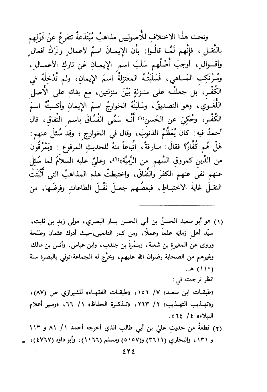 وتحت هذا الاختلافِ للأصوليين مذاهبُ مبْتَدَعةٌ تتفرعُ عنْ قَوْلِهم بالنقلِ، فإِنَهم لَمَّا قالوا: بأن الِإيمانَ اسم لأعمال وتَرْكُ أفعالا وأقوالٍ، أوجبَ أصْلُهم سَلْبَ اسمِ االِإيمانِ عَن تاركِ الأعمالِ، ومُرْتَكِب المَناهي، فَسَلَبَتْهُ المعتزلةُ اسمَ الإِيمانِ، ولم تدْخِلْة فى الكُفْرِ، بل جعلتْه على منزلةٍ بَيْنَ منزلتين، مع بقائهِ على الأصلِ اللُّغوي، وهو التصديقُ، وسَلَبَتْهُ الخوارج اسمَ الإيمانِ وأكسبتْهُ اسمَ الكفْرِ، وحُكِيَ عن الحَسنِ (١) أنَّه سَمَّى الفُسَّاقَ باسمِ النَفاقِ، قال أحمدُ فيه: كان يُعَظم الذنوبَ، وقال في الخوارجِ؛ وقد سُئلَ عنهم: هَلْ هُم كُفَار؟ فقالَ: مارقةٌ، اتِّباعاً منهُ للحديثِ المرفوع: "يَمْرقُون من الدينِ كمروقِ السهمِ من الرمية" (٢)، وعلى عليه السلاَمُ لما سُئِلَ عنهم نفى عنهم الكفرَ والنَفاقَ، واختبطتْ هذهِ المذاهب التي أثْبَتَتْ النقلَ غايةَ الاختباطِ، فبعضهم جعلَ نَفْلَ الطاعاتِ وفرضَها، من