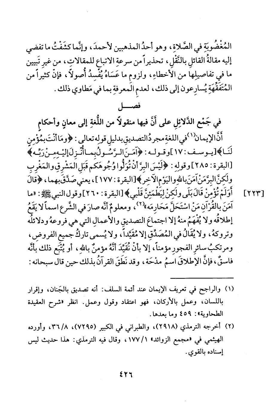 في جَمْع الدلائِلِ على أَن فيها منقولاً من اللغة إلى معانٍ وأحكامٍ أَن الإيمان (١) في اللغةِ مجردُ التصديقِ بدليلِ قوله تعالى: {وَمَا أَنْتَ بِمُؤْمِنٍ لَنَا} [يوسف: ١٧] وقوله: {آمَنَ الرَّسُولُ بِمَا أُنْزِلَ إِلَيْهِ مِنْ رَبِّهِ} [البقرة: ٢٨٥]، و {لَيْسَ الْبِرَّ أَنْ تُوَلُّوا وُجُوهَكُمْ قِبَلَ الْمَشْرِقِ وَالْمَغْرِبِ وَلَكِنَّ الْبِرَّ مَنْ آمَنَ بِاللَّهِ وَالْيَوْمِ الْآخِرِ} [البقرة: ١٧٧]، يعني صدق بهما، {قَالَ أَوَلَمْ تُؤْمِنْ قَالَ بَلَى وَلَكِنْ لِيَطْمَئِنَّ قَلْبِي} [البقرة: ٢٦٠]، وقول النبي صلى الله عليه وسلم: "ما آمَنَ بالقُرْآنِ مَنْ اسْتَحَل مَحَارِمَه" (٢)، ومعلومٌ أنَّه صارَ في الشَرع اسماً لا تقَعُ إطلاقُه ولا يفهَمُ منهُ إلا اجتماعَ التصديقِ والأعمالِ التي هي فروعهُ ودلائلُه وتروكهُ، ولاْ يقالُ في الصدق إلا مُقَيداً، ولا يُسمى تاركُ جميعِ الفروضِ، ومرتكبُ سائرِ الفجورِ مؤمناً، إلا بأنْ نُقَيدَ أنَّهُ مؤمنٌ الله، أو يُتْبَع ذلك بأنه فاسقٌ، فإنَّ الإطلاقَ اسمُ مدْحَة، وقد نَطَقَ القرآنُ بذلك حين قال سبحانه: