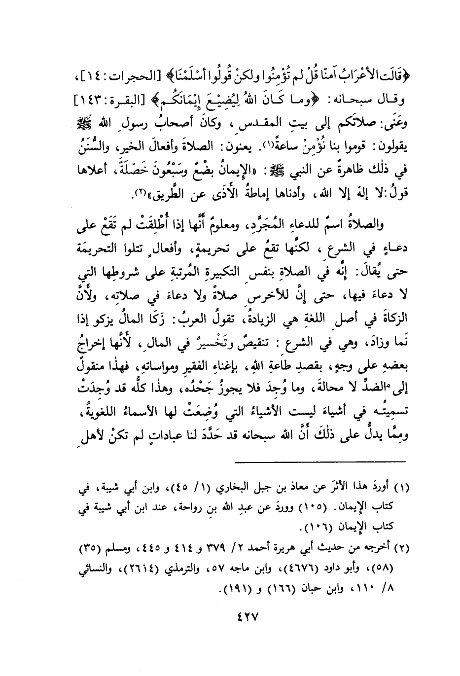 {قَالَتِ الْأَعْرَابُ آمَنَّا قُلْ لَمْ تُؤْمِنُوا وَلَكِنْ قُولُوا أَسْلَمْنَا} [الحجرات: ١٤] , وقال سبحانه: {وَمَا كَانَ اللَّهُ لِيُضِيعَ إِيمَانَكُمْ} [البقرة: ١٤٣]