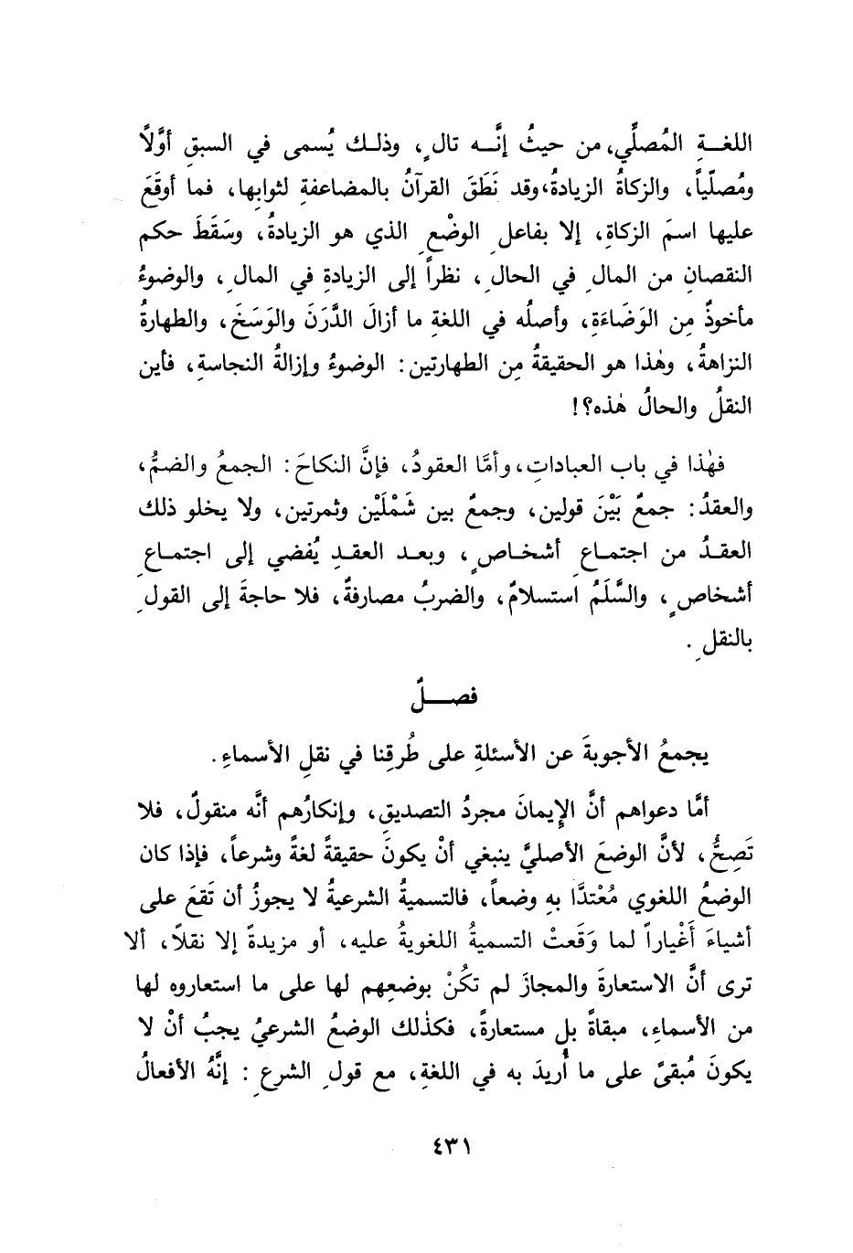 اللغةِ المُصلَّي، من حيثُ إنه تالٍ، وذلك يُسمى في السبقِ أوَّلًا ومُصلياً، والزكاةُ الزيادةُ، وقد نَطَقَ القرآنُ بالمضاعفةِ لثوابِها، فما أوقَعَ عليها اسمَ الزكاةِ، إلا بفاعلِ الوضْعِ الذي هو الزيادةُ، وسَقَطَ حكم النقصانِ من المالِ في الحالِ، نظراً إلى الزيادةِ في المالِ، والوضوءُ مأخوذٌ مِن الوَضَاءَةِ، وأصلُه في اللغةِ ما أزالَ الدرَنَ والوَسَخَ، والطهارةُ النزاهةُ، وهذا هو الحقيقةُ مِن الطهارتين: الوضوءُ وإزالةُ النجاسةِ، فأين النقلُ والحالُ هذه؟!