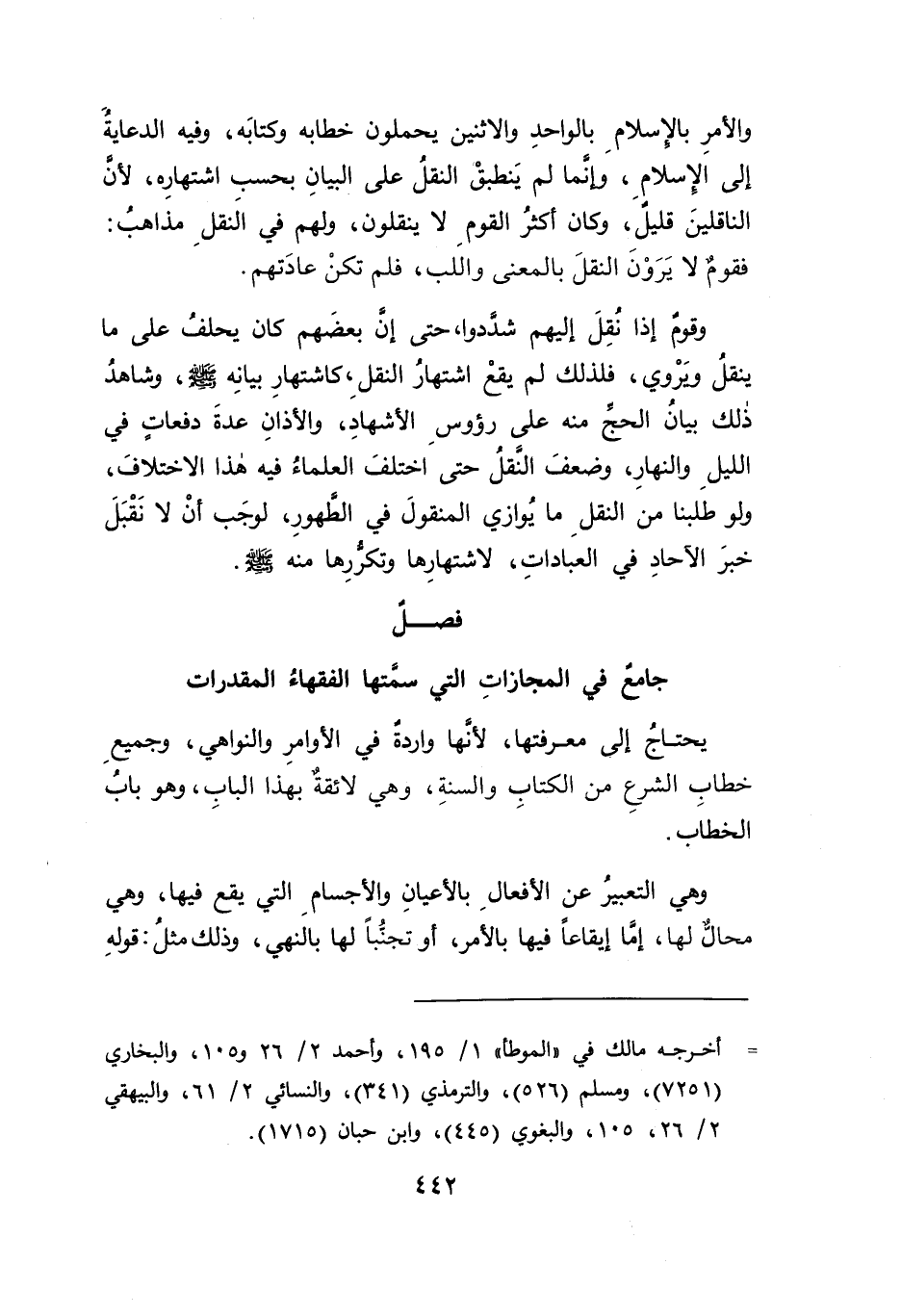 وقوم إذا نُقِلَ إليهم شددوا، حتى إن بعضَهم كان يحلفُ على ما ينقلُ وَيرْوي، فلذلك لم يقعْ اشتهارُ النقل، كاشتهارِ بيانِه - صلى الله عليه وسلم -، وشاهدُ ذلك بيانُ الحج منه على رؤوسِ الأشهادِ، والأذانِ عدةَ دفعاتٍ في الليلِ والنهارِ، وضعفَ النَّقلُ حتى اختلفَ العلماءُ فيه هذا الاختلافَ، ولو طلبنا من النقلِ ما يُوازي المنقولَ في الطهورِ، لوجَب أنْ لا نَقْبَلَ خبرَ الآحادِ في العباداتِ، لاشتهارِها وتكررِها منه - صلى الله عليه وسلم -.