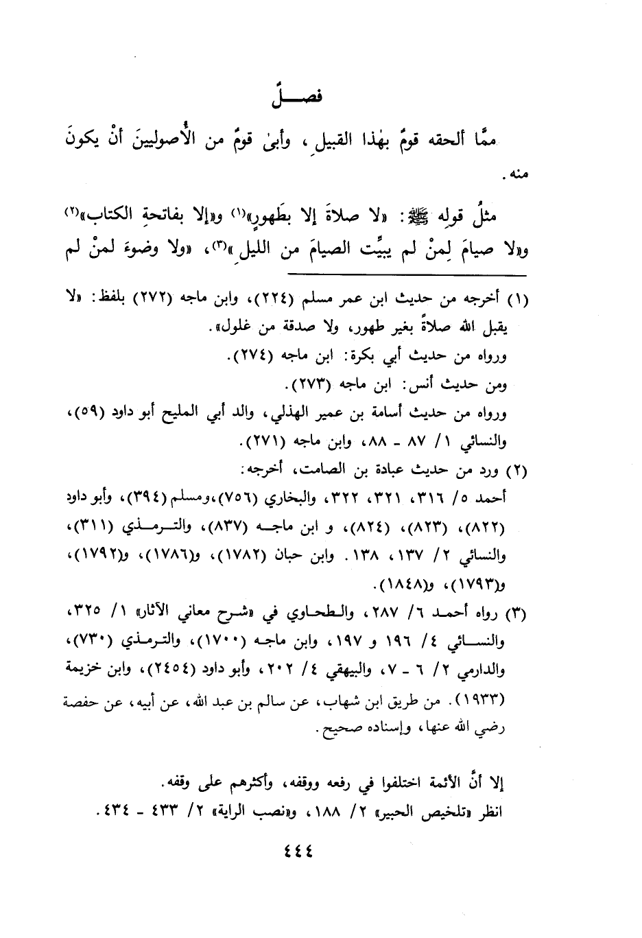 مما ألحقه قوم بهذا القبيلِ، وأبى قوم من الأصوليينَ أنْ يكونَ منه مثلُ قولِه - صلى الله عليه وسلم - "لا صلاةَ إلا بطَهور" (١) و" إلا بفاتحةِ الكتاب" (٢) و"لا صيامَ لِمنْ لم يبيِّت الصيامَ من الليلِ" (٣)، "ولا وضؤَ لمنْ لم