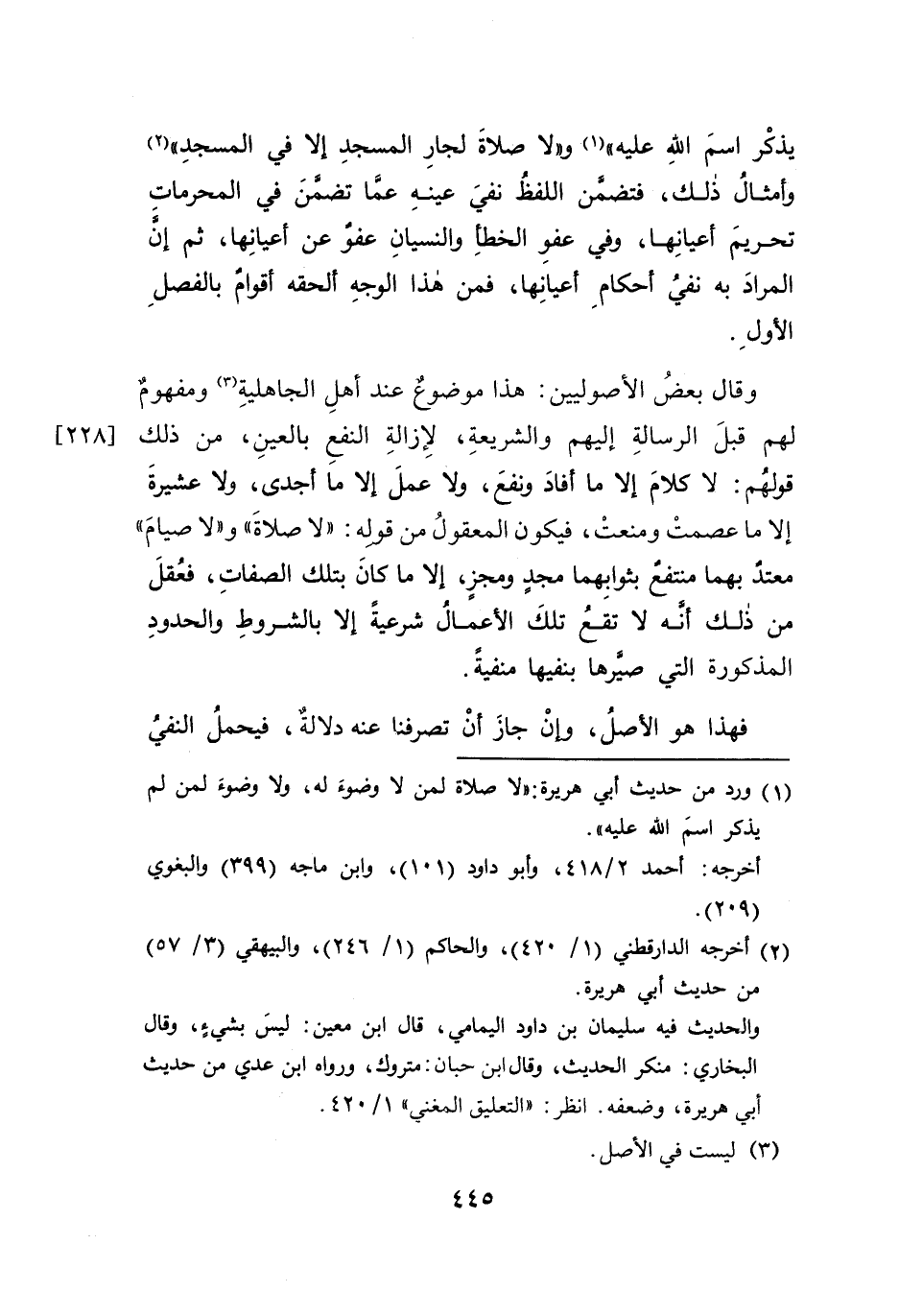 يذكْر اسمَ اللهِ عليه" (١) و"لا صلاةَ لجارِ المسجدِ إلا في المسجدِ" (٢) وأمثالُ ذلك، فتضمن اللفظُ نفيَ عينهِ عما تضمن في المحرمات تحريمَ أعيانِها، وفي عفوِ الخطأ والنسيانِ عفو عن أعيانِها، ثم إنَ المرادَ به نفيُ أحكامِ أعيانِها، فمن هذا الوجهِ ألحقه أقوام بالفصلِ الأولَ.