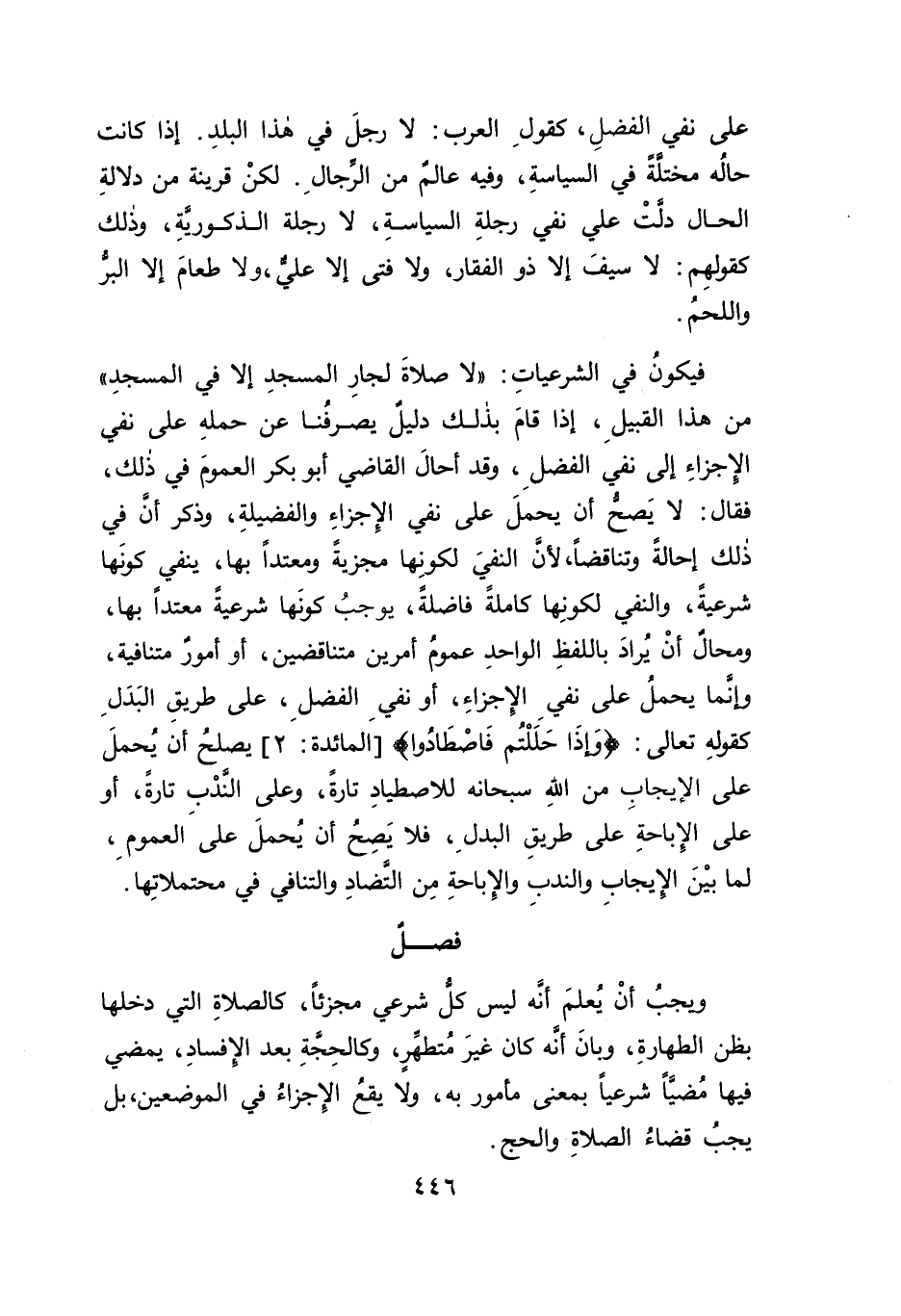 فيكونُ في الشرعياتِ: "لا صلاةَ لجارِ المسجدِ إلا في المسجدِ" من هذا القبيلِ، إذا قامَ بذلك دليل يصرفُنا عن حملهِ على نفي الإجزاءِ إلى نفي الفضلِ، وقد أحالَ القاضي أبو بكر العمومَ في ذلك، فقال: لا يَصح أن يحملَ على نفي الإِجزاءِ والفضيلةِ، وذكر أنَ في ذلك إحالةً وتناقضاً، لأنَ النفيَ لكونِها مجزيةً ومعتداً بها، ينفي كونَها شرعيةً، والنفي لكونِها كاملةً فاضلةً، يوجبُ كونَها شرعيةً معتداً بها، ومحالٌ أنْ يُرادَ باللفظِ الواحدِ عمومُ أمرين متناقضين، أو أمورٌ متنافية، وإنما يحملُ على نفيِ الِإجزاء أو نفيِ الفضلِ، على طريق البَدَلِ كقولهِ تعالى: {وَإذَا حَلَلْتُم فَاصْطَادُوا} [المائدة: ٢] يصلحُ أنَ يُحملَ على الإيجابِ من اللهِ سبحانه للاصطيادِ تارةً، وعلى الندْب تارةً، أو على الإِباحةِ على طريقِ البدلِ، فلا يَصِحُ أن يُحملَ علىَ العموم، لما بيْنَ الإيجابِ والندبِ والإِباحةِ مِن التضادِ والتنافي في محتملاتِها.