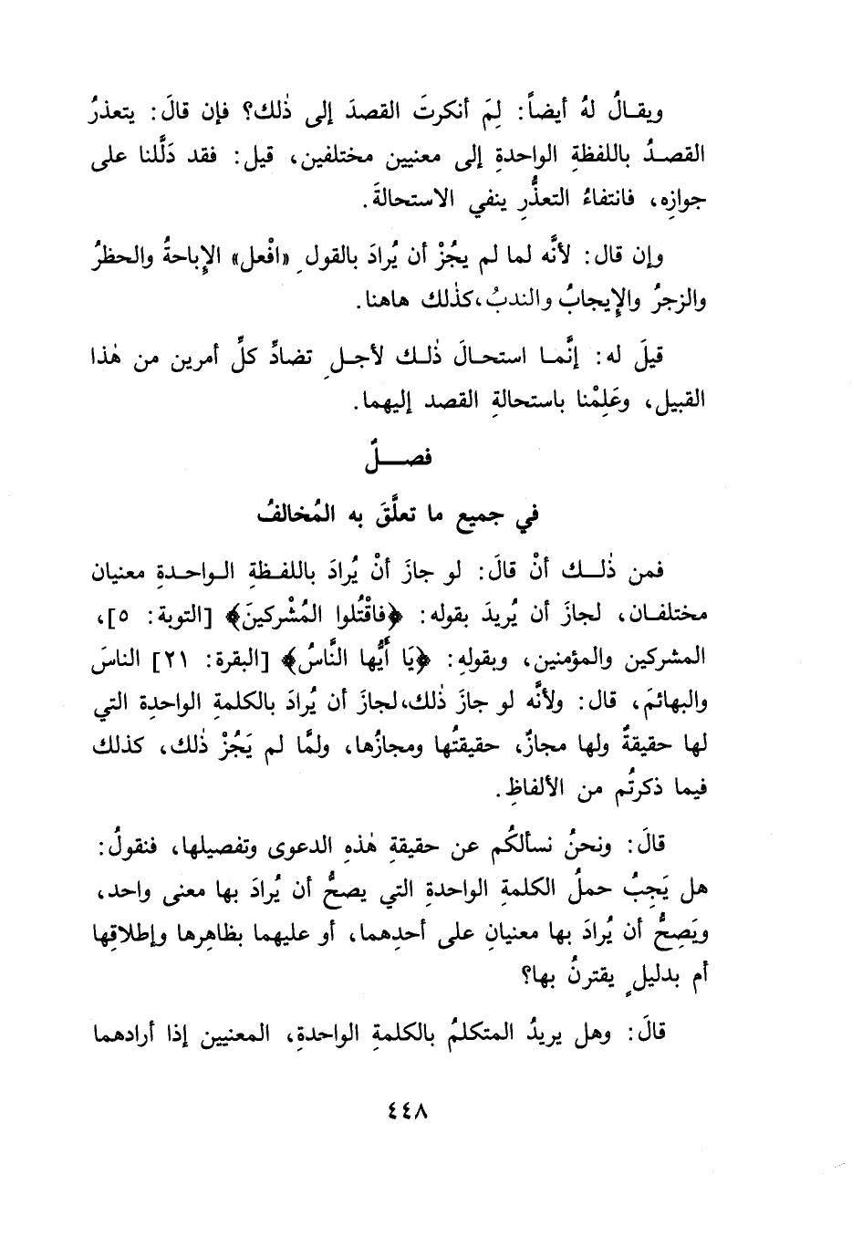 فمن ذلك أنْ قالَ: لو جازَ أنْ يُرادَ باللفظةِ الواحدةِ معنيان مختلفان، لجازَ أن يُريدَ بقوله: {فَاقْتُلُوا الْمُشْرِكِينَ} [التوبة: ٥]، المشركين والمؤمنين، وبقولهِ: {يَا أَيُّهَا النَّاسُ} [البقرة: ٢١] الناسَ والبهائمَ، قال: ولأنَّه لو جازَ ذلك، لجازَ أن يُرادَ بالكلمةِ الواحدِة التي لها حقيقة ولها مجازٌ، حقيقتُها ومجازُها، ولما لم يَجُزْ ذلك، كذلك فيما ذكرتُم من الألفاظِ.