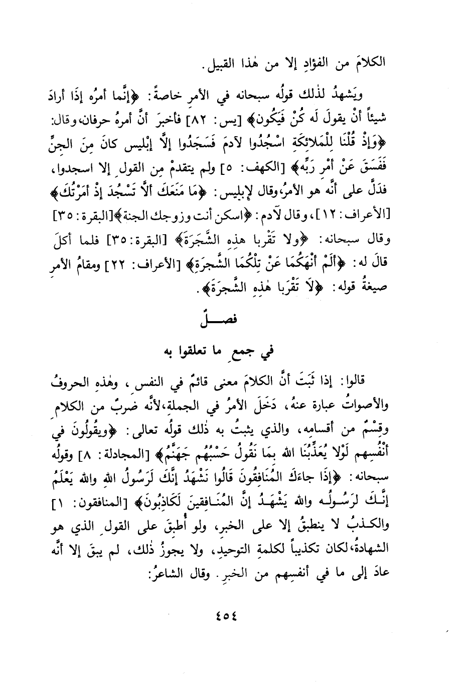 قالوا: إذا ثَبَتَ أن الكلامَ معنى قائم في النفسِ، وهذهِ الحروفُ والأصواتُ عبارة عنه، دَخَلَ الأمر في الجملة، لأنه ضربٌ من الكلامِ وقِسْم من أقسامِه، والذي يثبتُ به ذلك قوله تعالى: {وَيَقُولُونَ فِي أَنْفُسِهِمْ لَوْلَا يُعَذِّبُنَا اللَّهُ بِمَا نَقُولُ حَسْبُهُمْ جَهَنَّمُ} [المجادلة: ٨] وقولُه سبحانه: {إِذَا جَاءَكَ الْمُنَافِقُونَ قَالُوا نَشْهَدُ إِنَّكَ لَرَسُولُ اللَّهِ وَاللَّهُ يَعْلَمُ إِنَّكَ لَرَسُولُهُ وَاللَّهُ يَشْهَدُ إِنَّ الْمُنَافِقِينَ لَكَاذِبُونَ (١)} [المنافقون: ١]