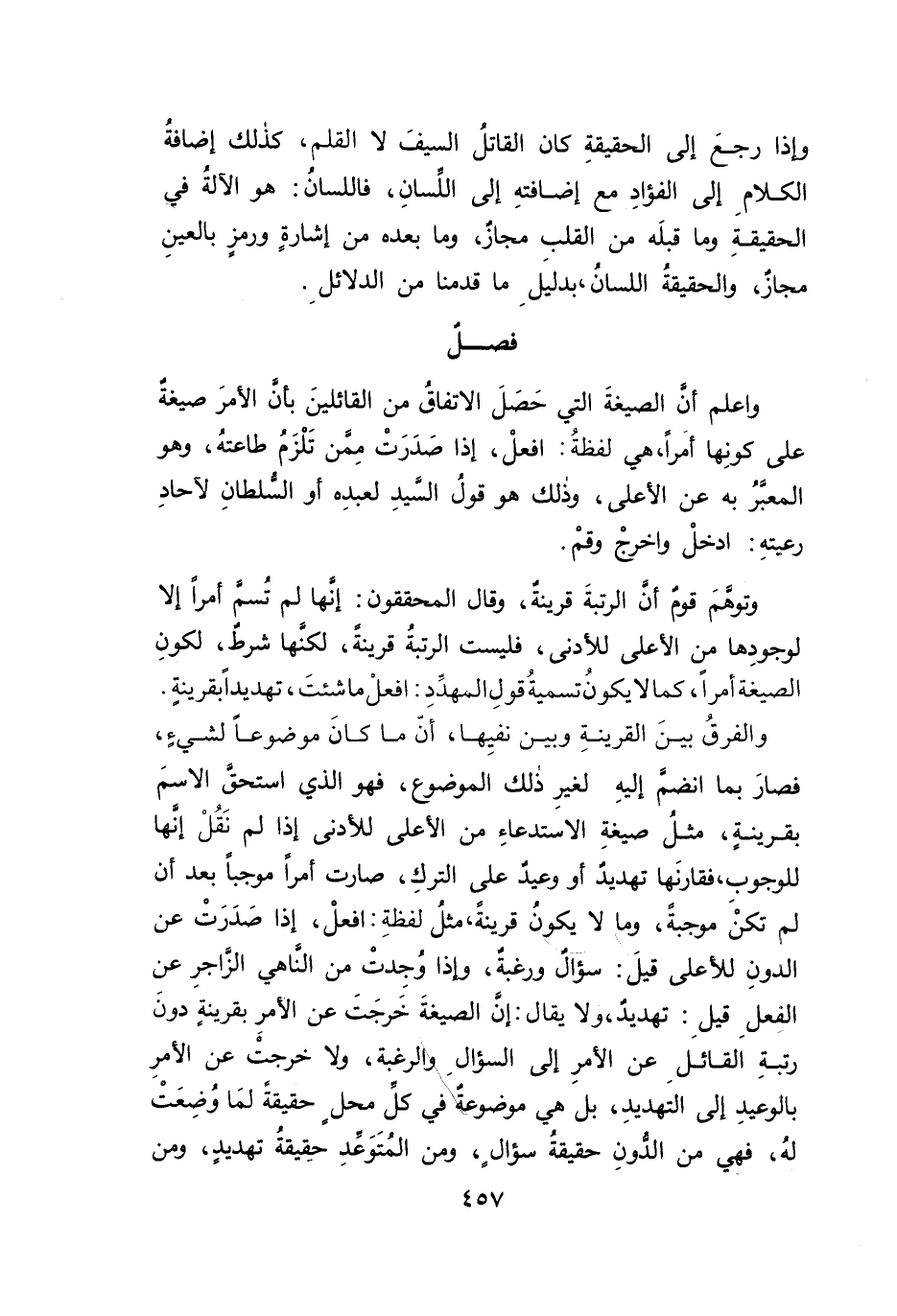 وتوهَّم قومٌ أنَّ الرتبةَ قرينة، وقال المحققون: إنها لم تُسم أمراً إلا لوجودِها من الأعلى للأدنى، فليست الرتبةُ قرينةً، لكنها شرطٌ، لكونِ الصيغة أمراً، كما لا يكونُ تسميةُ قولِ الممهدِّدِ: افعلْ ما شئتَ، تهديداً بقرينةٍ.