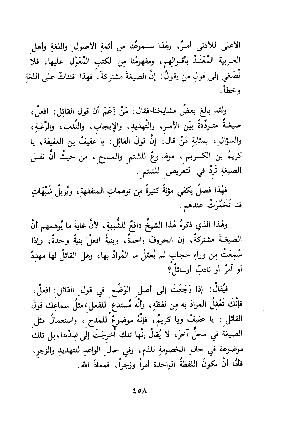 ولقد بالغ بعضُ مشايخنا، فقال: مَنْ زَعَمَ أن قولَ القائِل: افعلْ، صيغةٌ متردِّدةٌ بيْن الأمرِ، والتَّهديدِ، والإيجابِ، والندب، والرغبةِ، والسؤالِ، بمثابةِ مَنْ قال: إن قولَ القائل: يا عفيفُ بنَ العفيفةِ، يا كريمُ بن الكريمِ، موضوعٌ للشتمِ والمدحِ، من حيثُ أنَّ نفسَ الصيغةِ تَرِدُ في التعريضِ للشتمِ.