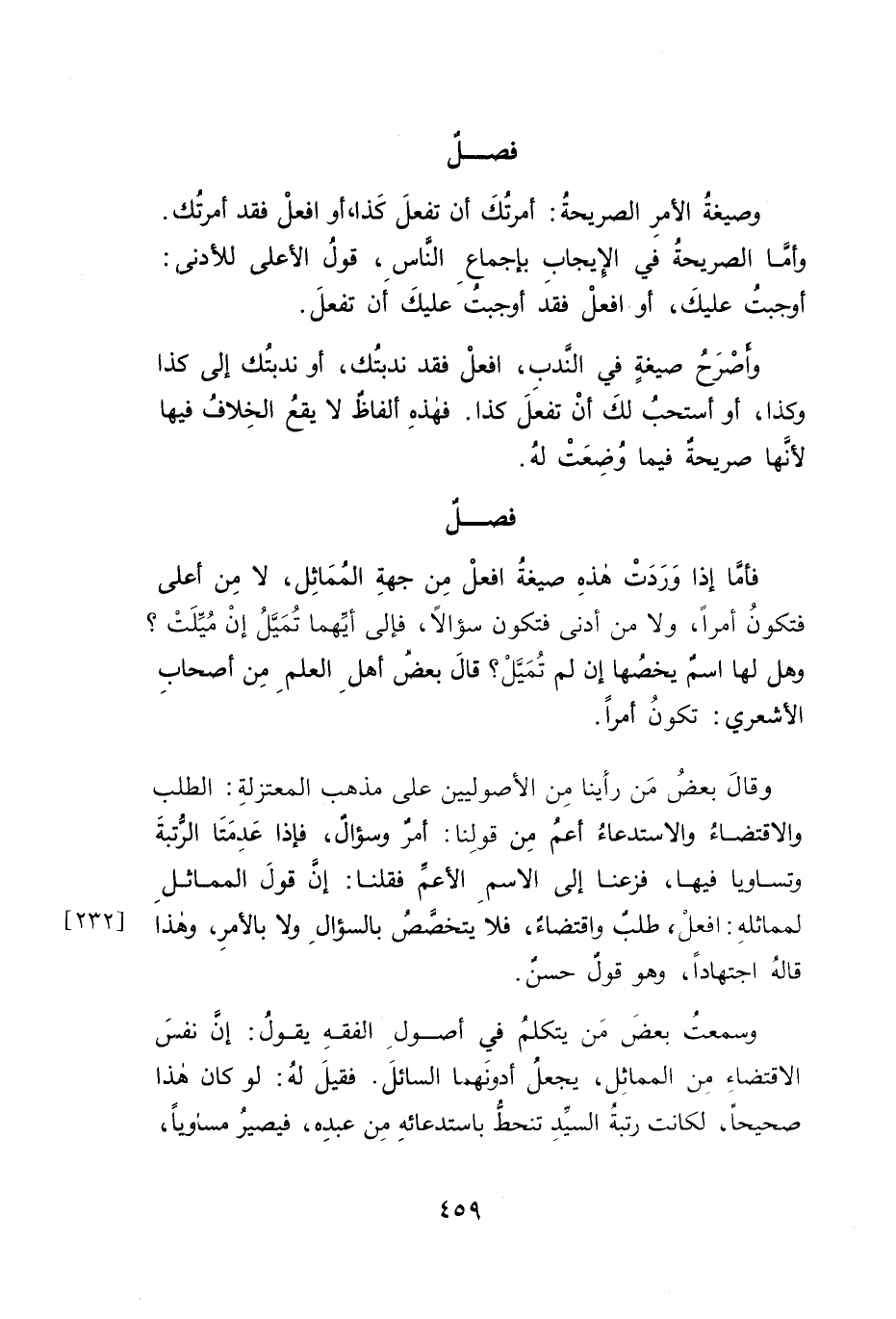 وسمعتُ بعضَ مَن يتكلم في أصولِ الفقه يقول: إنَ نفسَ الاقتضاءِ مِن المماثِل، يجعل أدونَهما، السائلَ. فقيلَ لهُ: لو كان هذا صحيحاً، لكانت رتبة السيَّدِ تنحطُّ باستدعائهِ مِن عبدِه، فيصير مساوياً،