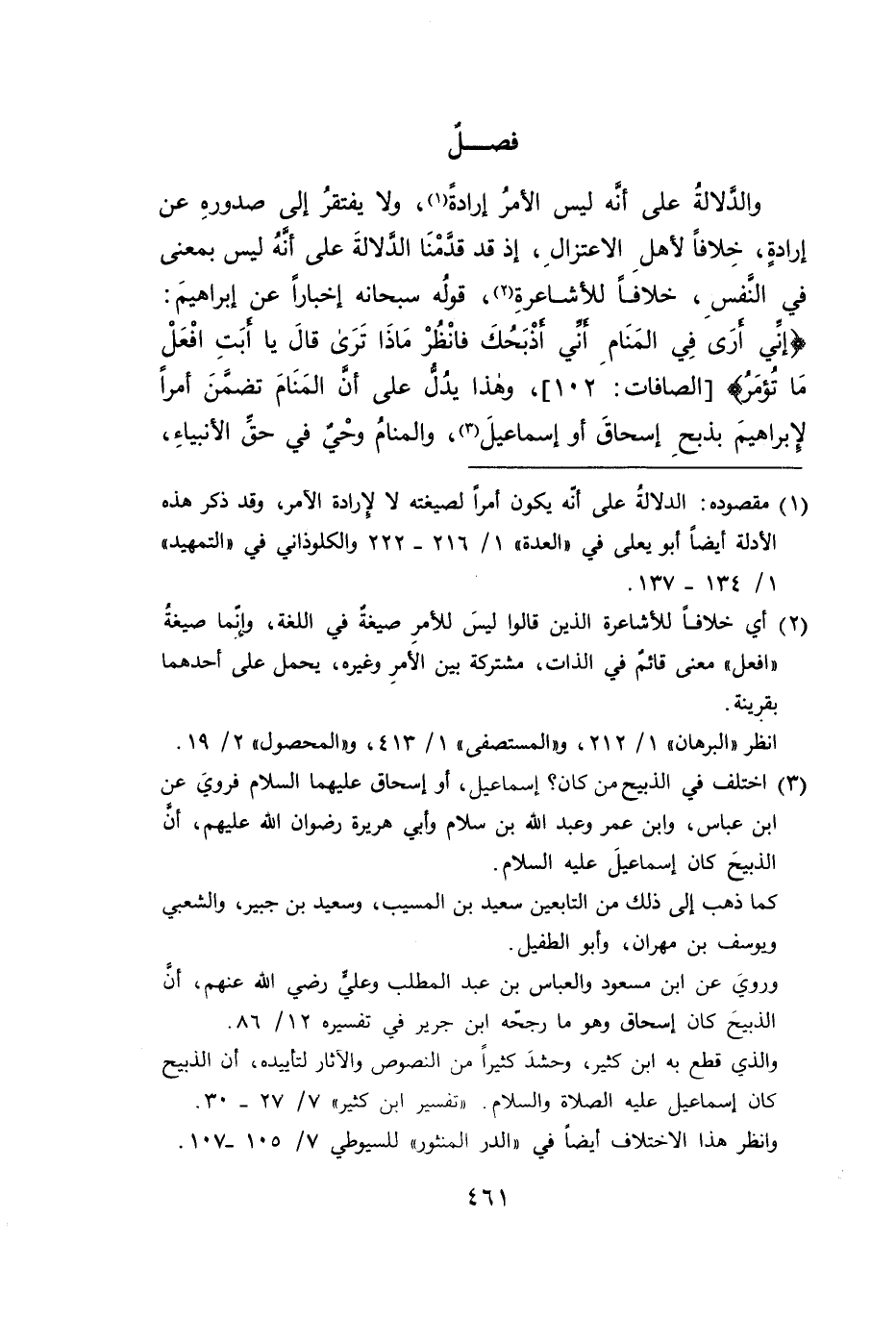 والدلالةُ على أنه ليس الأمرُ إرادةً (١)، ولا يفتقرُ إلى صدورهِ عن إرادةٍ، خِلافاً لأهلِ الاعتزالِ، إذ قد قدمْنَا الدلالةَ على أنهُ ليس بمعنى في النَفسِ، خلافاً للأشاعرةِ (٢)، قولُه سبحانه إخباراً عن إبراهيمَ: {إِنِّي أَرَى فِي الْمَنَامِ أَنِّي أَذْبَحُكَ فَانْظُرْ مَاذَا تَرَى قَالَ يَا أَبَتِ افْعَلْ مَا تُؤْمَرُ} [الصافات: ١٠٢]، وهذا يدُلُّ على أن المَنَامَ تضمن أمراً لإبراهيمَ بذبحِ إسحاقَ أو إسماعيلَ (٣)، والمنامُ وحْيٌ في حق الأنبياءِ،