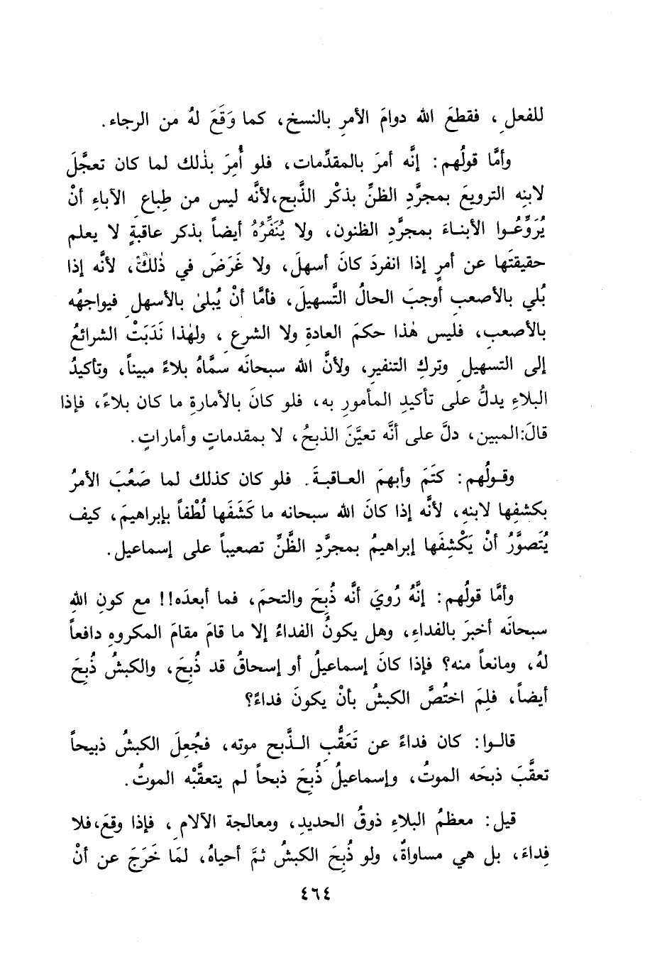 وأمَّا قولُهم: إنَّه أمرَ بالمقدِّمات، فلو أمِرَ بذلك لما كان تعجلَ لابنِه الترويعَ بمجرَّدِ الظنِّ بذكْر الذَّبح، لأنَه ليس من طِباعِ الآباءِ أنْ يُرَوعُوا الأبناءَ بمجردِ الظنون، ولا يُنَفرُهُ أيضاً بذكر عاقبةٍ لا يعلم حقيقتَها عن أمرٍ إذا انفردَ كانَ أسهلَ، ولا غَرَضَ في ذلك، لأنَّه إذا بُلي بالأصعب أوجبَ الحالُ التسهيلَ، فأمَّا أنْ يُبلى بالأسهلِ فيواجهُه بالأصعب، فلَيس هذا حكمَ العادةِ ولا الشرع، ولهذا نَدَبَتْ الشرائعُ إلى التسَهيلِ وتركِ التنفيرِ، ولأن الله سبحانه سَماهُ بلاءً مبيناً، وتأكيدُ البلاءِ يدلُّ على تأكيدِ المأمورِ به، فلو كانَ بالأمارةِ ما كان بلاءً، فإذا قالَ: المبين، دلَّ على أنه تعيَّنَ الذبحُ، لا بمقدماتٍ وأماراتٍ.
