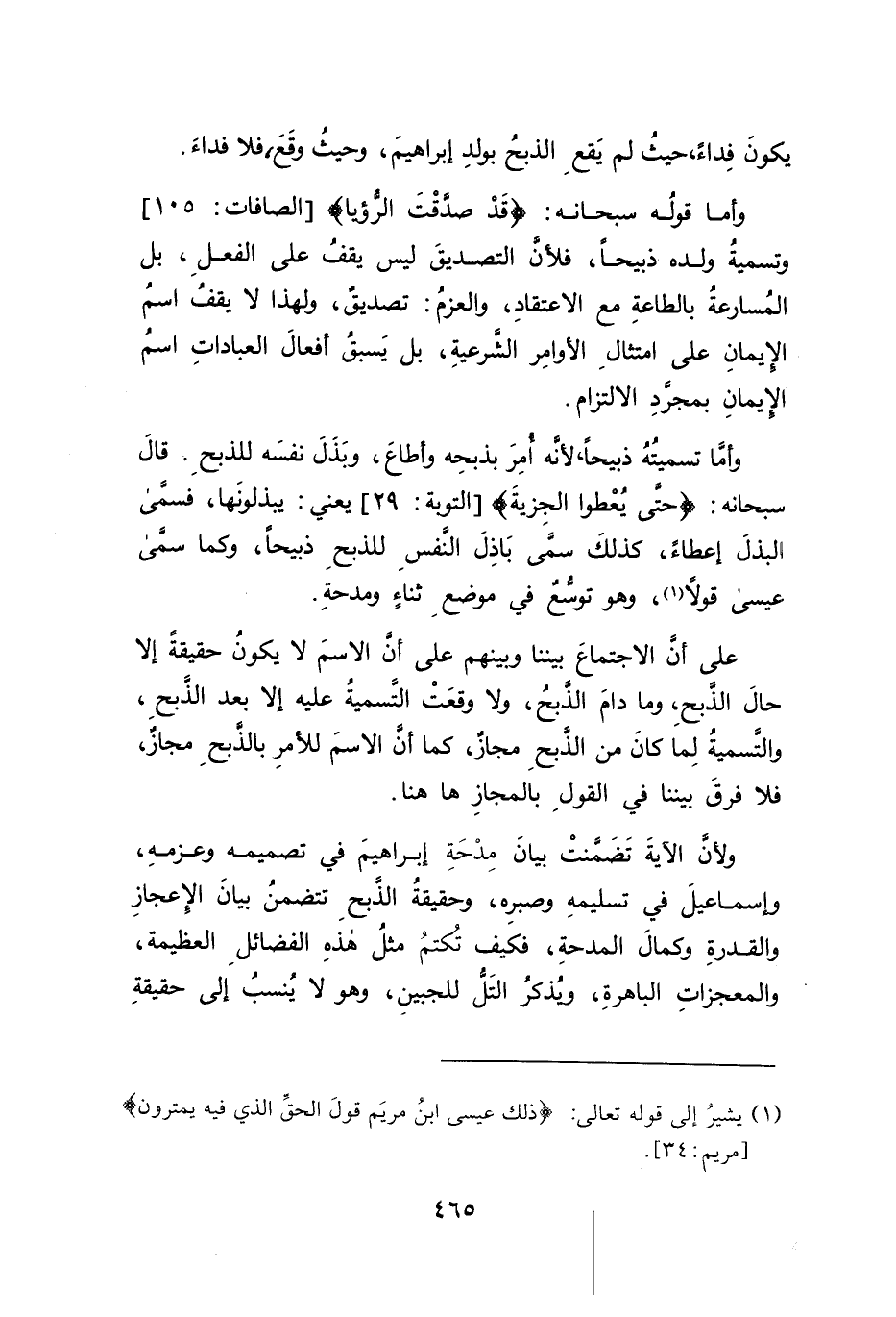 وأمَّا تسميتُهُ ذبيحاً، لأنه أُمِرَ بذبحِه وأطاعَ، وبَذَلَ نفسَه للذبحِ. قالَ سبحانه: {حَتَّى يُعْطُوا الْجِزْيَةَ} [التوبة: ٢٩] يعني: يبذلونها، فسمَّي البذلَ إعطاءً، كذلكَ سمَّى بَاذِلَ النَّفسِ للذبحِ ذبيحاً، وكما سمَّى عيسى قولًا (١)، وهو توسُّعٌ في موضعِ ثناءٍ ومدحةِ.