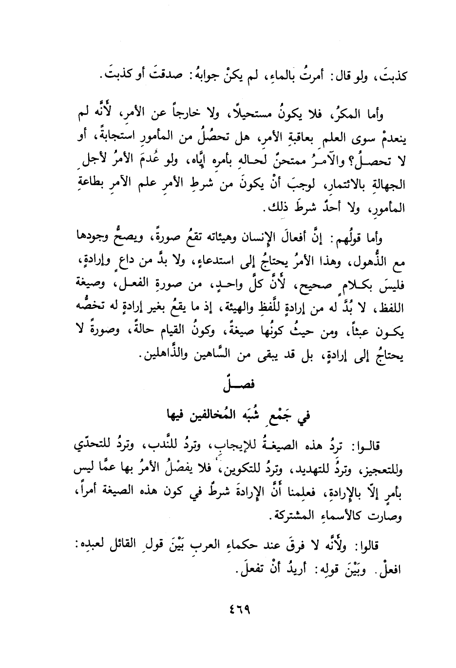 وأما المكرُ، فلا يكونُ مستحيلًا، ولا خارجاً عن الأمرِ، لأنه لم ينعدمْ سوى العلمِ بعاقبةِ الأمرِ، هل تحصُلُ من المأمورِ استجابةً، أو لا تحصلُ؟ والآمرُ ممتحن لحالهِ بأمرِه إيَّاه، ولو عُدمَ الأمرُ لأجلِ الجهالةِ بالائتمارِ، لوجبَ أنْ يكونَ من شرطِ الأمرِ علم الآمرِ بطاعةِ المأمورِ، ولا أحدٌ شرطَ ذلك.