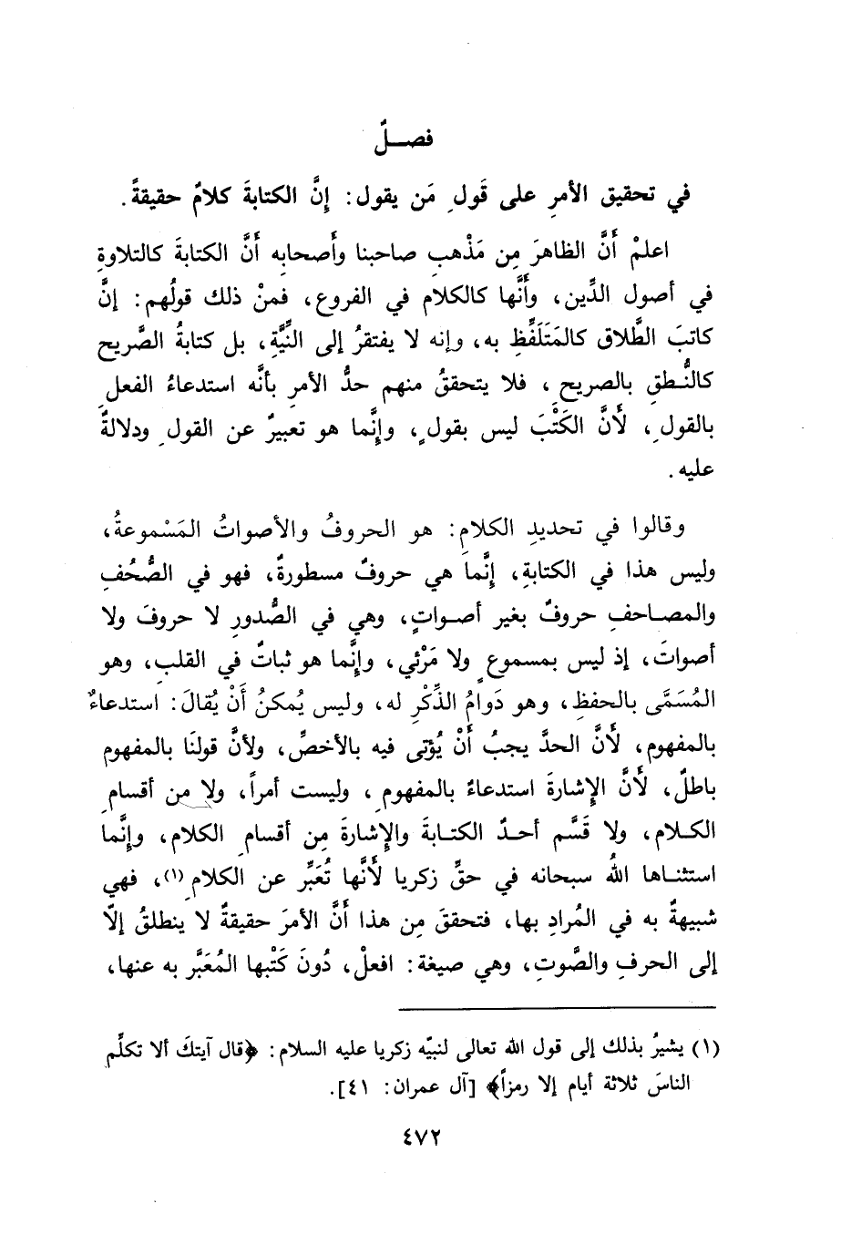 وقالوا في تحديدِ الكلامِ: هو الحروفُ والأصواتُ المَسْموعةُ، وليس هذا في الكتابةِ، إنما هي حروفٌ مسطورةٌ، فهو في الصُّحُفِ والمصاحفِ حروفٌ بغير أصواتٍ، وهي في الصدورِ لا حروفَ ولا أصواتَ، إذ ليس بمسموع ولا مَرْئي، وإنما هو ثبات في القلب، وهو المُسَمَّى بالحفظِ، وهو دَوامُ الذِّكْرِ له، وليس يُمكنُ أَنْ يقالَ: اَستدعاءٌ بالمفهوم، لأن الحد يجبُ انْ يُملى فيه بالأخصِّ، ولأن قولنَا بالمفهوم باطلٌ، لأنَّ الإشارةَ استدعاء بالمفهوم، وليست أمراً، ولا من أقسام الكلام، ولا قَسم أحد الكتابةَ والإشَارةَ مِن أقسام الكلام، وإنماَ استثناها اللهُ سبحانه في حق زكريا لأنَها تُعَبِّر عن اَلكلام (١)، فهي شبيهةٌ به في المُرادِ بها، فتحققَ مِن هذا أنَّ الأمرَ حقيقة لاَ ينطلقُ الأ إلى الحرفِ والصوت، وهي صيغة: افعلْ، دُونَ كَتْبها المُعَبر به عنها،