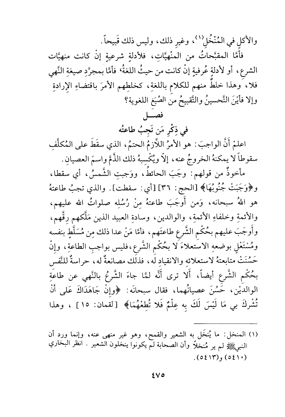 مأخوذٌ من قولهم: وجَبَ الحائطُ، ووَجبتِ الشَّمسُ، أيمما سقطا، {وَجَبَتْ جُنُوبُهَا} [الحج: ٣٦] [أي: سقطت]. والذين تجبُ طاعتهُ هو اللهُ سبحانه، وَمن أَوجَبَ طاعتهُ مِنْ رُسُلِه صلواتُ الله عليهم، والأئمةِ وخلفاءِ الأئمةِ، والوالدين، وسادةِ العبيد الذين مَلكهم رِقَهم، وأَوجَبَ عليهم بحُكْمِ الشَرعِ طاعتَهم، فأمَّا مَنْ عدا ذلك مِن مُسَلطٍ بنفسه ومُستعْلٍ بوضعهِ الاستعلاءَ لا بحُكْمِ الشَّرعِ، فليس بواجبِ الطاعةِ، وإِنْ حَسنتْ متابعتهُ لاستعلائهِ والانقيادِ له، فذلك مصانعةٌ له، حراسةٌ للنَّفسِ بحكْمِ الشَرعِ أيضاً، أَلا ترى أنه لمَّا جاءَ الشَرعُ بالنَّهي عن طاعةِ الوالديْن، حَسنَ عصيانُهما، فقال سبحانَه: {وَإِنْ جَاهَدَاكَ عَلَى أَنْ تُشْرِكَ بِي مَا لَيْسَ لَكَ بِهِ عِلْمٌ فَلَا تُطِعْهُمَا} [لقمان: ١٥]، وهذا