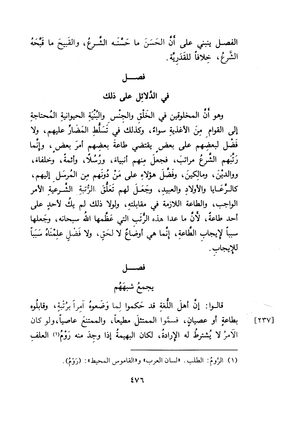 الفصل ينبني على أن الحَسَنَ ما حَسنَه الشرعُ، والقَبيحَ ما قَبحَة الشَّرعُ، خِلافاً للقَدَرِية.