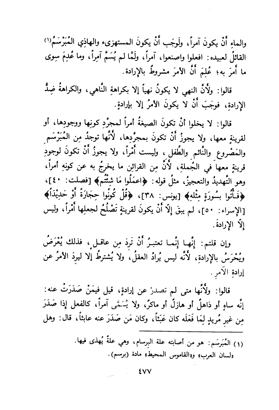 والماءِ أنْ يكونَ آمراً، ولَوجَب أنْ يكونَ المستهزىء والهاذِي المُبَرْسَمُ (١) القاثلُ لعبيده: افعلوا واصنعوا، آمراً، ولَمَا لم يُسَم آمِراً، وما عُدِمَ سِوى ما أمرَ به؛ عُلِمَ أن الأمرَ مشروط بالإرادة.