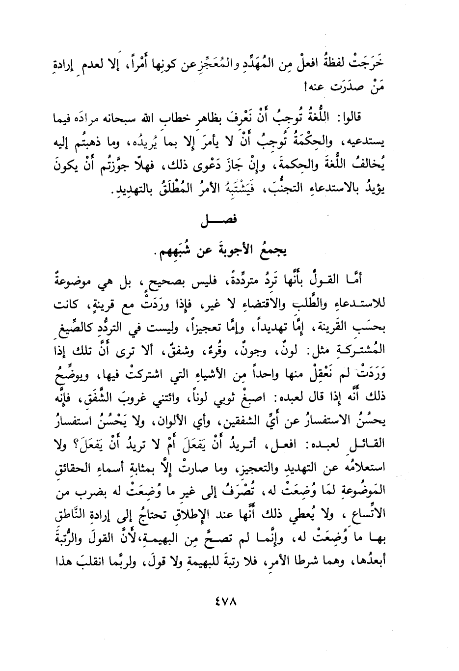 أمَّا القول بأنها تَرِدُ متردِّدةً، فليس بصحيح، بل هي موضوعة للاستدعاءِ والطلب والاقتضاءِ لا غير، فإذا ورَدَتْ مع قرينةٍ، كانت بحسَب القَرينة، إمَّا تهديداً، وإما تعجيزاً، وليست في الترددِ كالصيغِ المُشترَكةِ مثل: لونٌ، وجونٌ، وقُرءٌ، وشفقٌ، ألا ترى أنَّ تلك إذا وَرَدَتْ لم نَعْقِلْ منها واحداً مِن الأشياءِ التي اشتركتْ فيها، ويوضِّحُ ذلك أنه إِذا قال لعبده: اصبغْ ثوبي لوناً، وائتني غروبَ الشَّفَقِ، فإنَّه يحسُنُ الاستفسارُ عن أيَ الشفقين، وأي الألوان، ولا يَحْسُنُ استفسارُ القائلِ لعبده: افعل، أتريدُ أنْ يَفعَلَ أمْ لا تريدُ أنْ يَفعَلَ؟ ولا استعلامُه عن التهديدِ والتعجيزِ، وما صارتْ إلا بمثابةِ أسماءِ الحقائقِ المَوضُوعةِ لمَا وضِعَتْ له، تُصْرَفُ إلى غيرِ ما وضِعَتْ له بضرب من الاتَساعِ، ولا يُعطي ذلك أنَّها عند الِإطلاقِ تحتاجُ إلى إرادةِ النَاطقِ بها ما وضِعَتْ له، وإِنَما لم تصحَّ مِن البهيمةِ، لأنَّ القولَ والرتبةَ أبعدُها، وهما شرطا الأمرِ، فلا رتبةَ للبهيمةِ ولا قولَ، ولربَّما انقلبَ هذا
