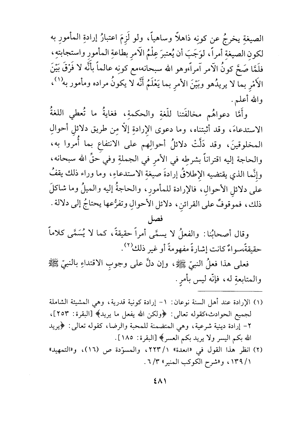 وأَمَّا دعواهُم مخالفَتنا للّغةِ والحكمةِ، فغايةُ ما تُعطي اللغةُ الاستدعاءَ، وقد أثبتناه، وما دعوى الإِرادةِ إلاّ مِن طريق فى دلائلِ أحوالِ المخلوقينَ، وقد دَلتْ دلائلُ أحوالِهم على الانتفاعِ بما أُمروا به، والحاجة إليه اقتراناً بشرطِه في الأمرِ في الجملةِ وفي حقِّ الله سبحانه، وإِنَّما الذي يقتضيه الإِطلاق إرادة صيغةِ الاستدعاءِ، وما وراء ذلك يقفُ علي دلائلِ الأحوالِ، فالإرادة للمأمورِ، والحاجةُ إليه والميلُ وما شاكلَ ذلك، فموقوفٌ على القرائنِ، دلائل الأحوالِ وتفرُّعها يحتاج إلى دلالة.