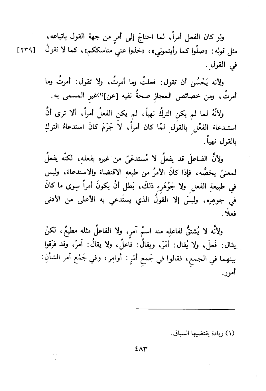 ولأن الفاعلَ قد يفعلُ لا مُستدعَىً من غيره بفعلهِ، لكنه يفعل لمعنىً يخصه، فإذا كانَ الأمرُ من طبعهِ الاقتضاءَ والاستدعاءَ، وليس في طبيعةِ الفعلِ ولا جَوْهَرِهِ ذلكَ، بَطل أنْ يكونَ أمراً سِوى ما كانَ في جوهِره، وليسَ إلا القولُ الذي يستَدعي به الأعلى من الأدنى فعلًا.