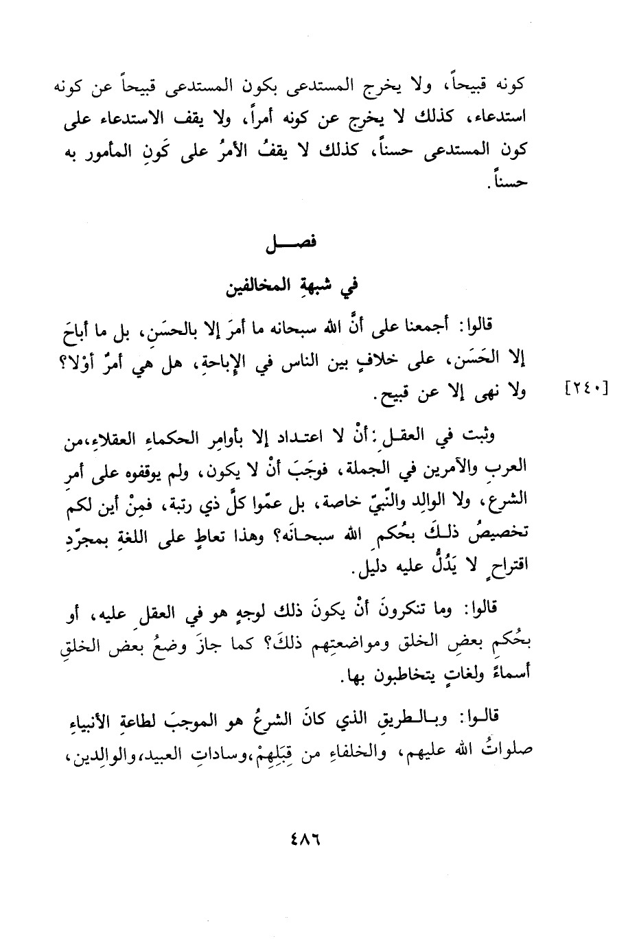 وثبت في العقلِ أنْ لا اعتداد إلا بأوامِر الحكماءِ العقلاءِ، من العربِ والآمرين في الجملة، فوجَبَ أنْ لا يكون، ولم يوقفوه على أمرِ الشرع، ولا الوالِد والنبيّ خاصة، بل عمّوا كلُّ ذي رتبة، فمِنْ أين لكم تخصيصُ ذلكَ بحُكمِ الله سبحانَه؟ وهذا تعاطٍ على اللغةِ بمجردِ اقتراحٍ لا يدل عليه دليل.