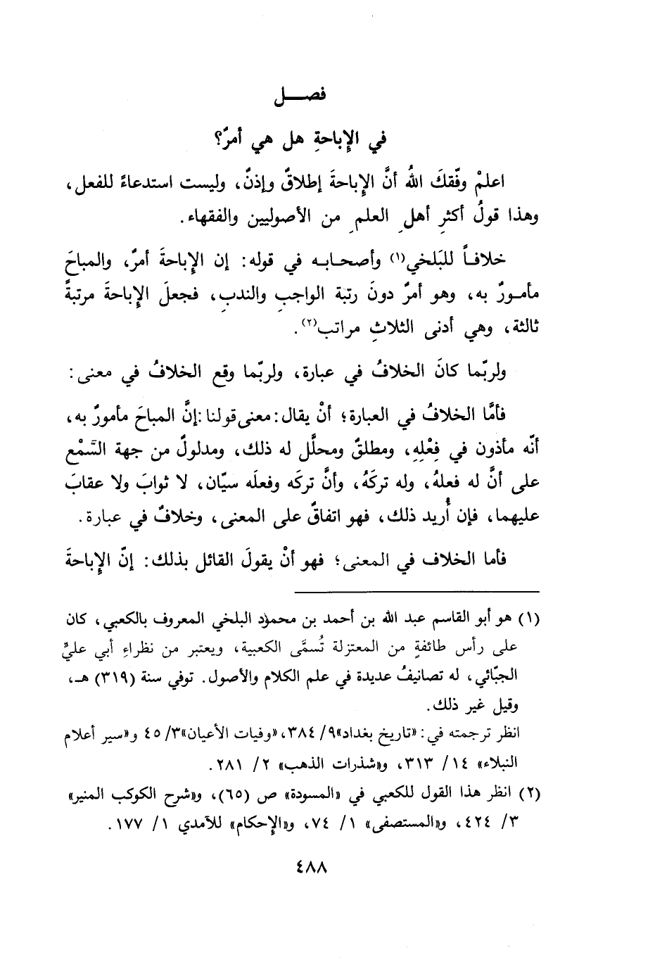 خلافاً للبَلخي (١) وأصحابه في قوله: إن الإباحةَ أمرٌ، والمباحٍ مأمورٌ به، وهو أمرٌ دونَ رتبة الواجبِ والندبِ، فجعلَ الإباحةَ مرتبة ثالثة، وهي أدنى الثلاثِ مراتب (٢).