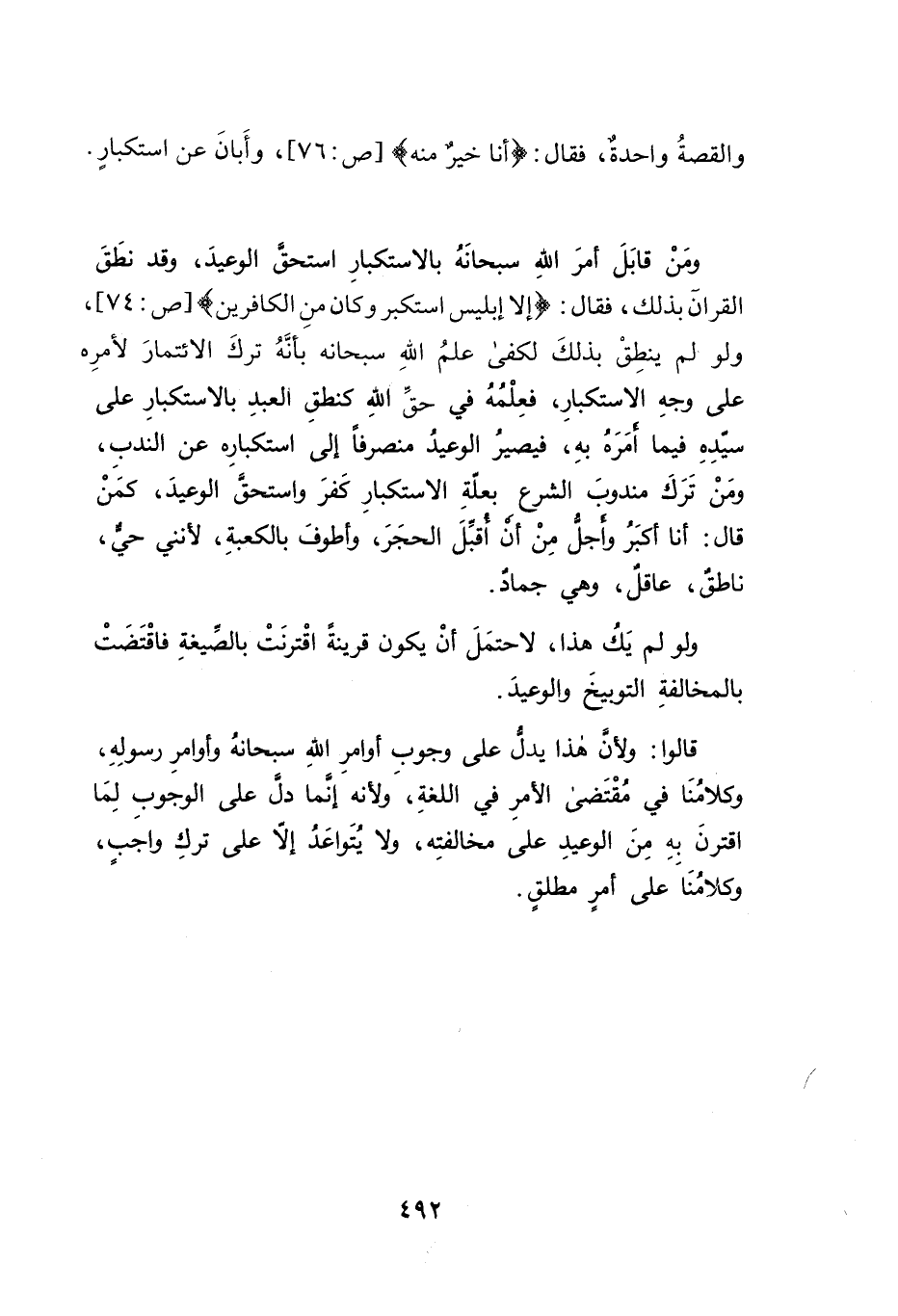 ومَنْ قابَلَ أمرَ اللهِ سبحانَهُ بالاستكبارِ استحق الوعيدَ، وقد نطَقَ القرآن بذلك، فقال: {إلا إبليس استكبر وكان منِ الكافرين} [ص: ٧٤]، ولو لم ينطِقْ بذلكَ لكفى علمُ الله سبحانه بأنَهُ تركَ الائتمارَ لأمرِه على وجهِ الاستكبارِ، فعِلْمُهُ في حقَ اللهِ كنطقِ العبدِ بالاستكبارِ على سيدِهِ فيما أمَرَهُ بهِ، فيصيرُ الوعيدُ منصرفاً إلى استكبارِه عن الندب، ومَنْ تَرَكَ مندوبَ الشرع بعلةِ الاستكبارِ كَفرَ واستحق الوعيدَ، كمنْ قال: أنا أكبَرُ وأجلُّ مِنْ أن اقبلَ الحجَرَ، وأطوفَ بالكعبةِ، لأنني حيٌّ، ناطقٌ، عاقلٌ، وهي جمادٌ.