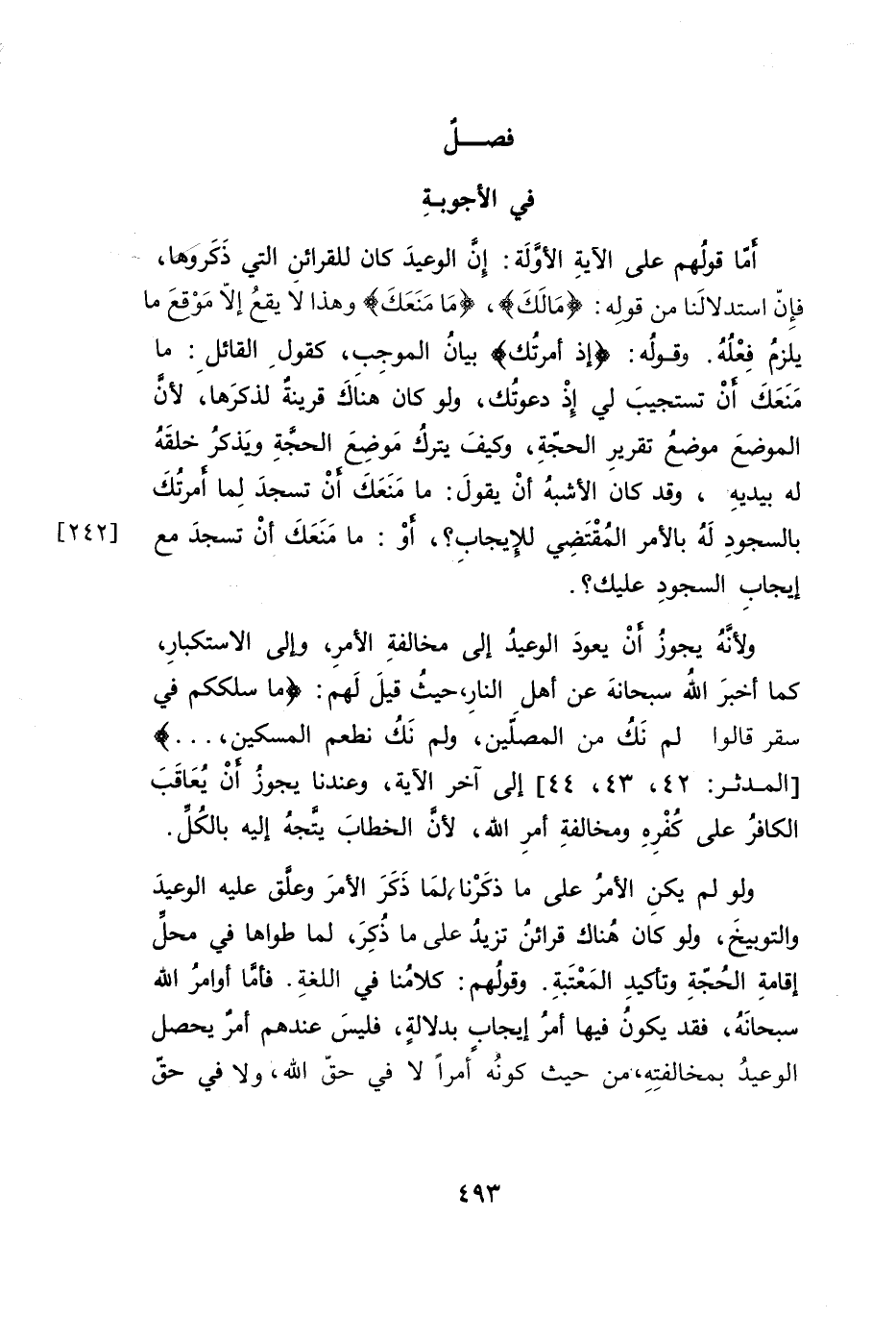 أمَّا قولهم على الآيةِ الأولَة: إِن الوعيدَ كان للقرائنِ التي ذَكَروَها، فإِنّ استدلالَنا من قوله: {مَالِكِ}، {مَا مَنَعَكَ} وهذا لا يقعُ إلاّ مَوْقع ما يلزمُ فِعْلُهُ. وقولُه: {إِذْ أَمَرْتُكَ} بيانُ الموجِب، كقولِ القائلِ: ما مَنَعَكَ أنَّ تستجيبَ لي إِذْ دعوتُك، ولو كان هناَكَ قرينةٌ لذكرَها، لأنَّ الموضعَ موضعُ تقريرِ الحجّةِ، وكيفَ يتركُ مَوضِعَ الحجةِ وَيذكرُ خلقَهُ له بيديهِ، وقد كان الأشبهُ أنْ يقولَ: ما مَنَعَكَ أنَّ تسجدَ لِما امرتُكَ بالسجودِ لَهُ بالأمر المُقْتَضِي للإيجابِ؟، أوْ: ما مَنَعَكَ أنْ تسجدَ مع إيجابِ السجودِ عليك؟.
