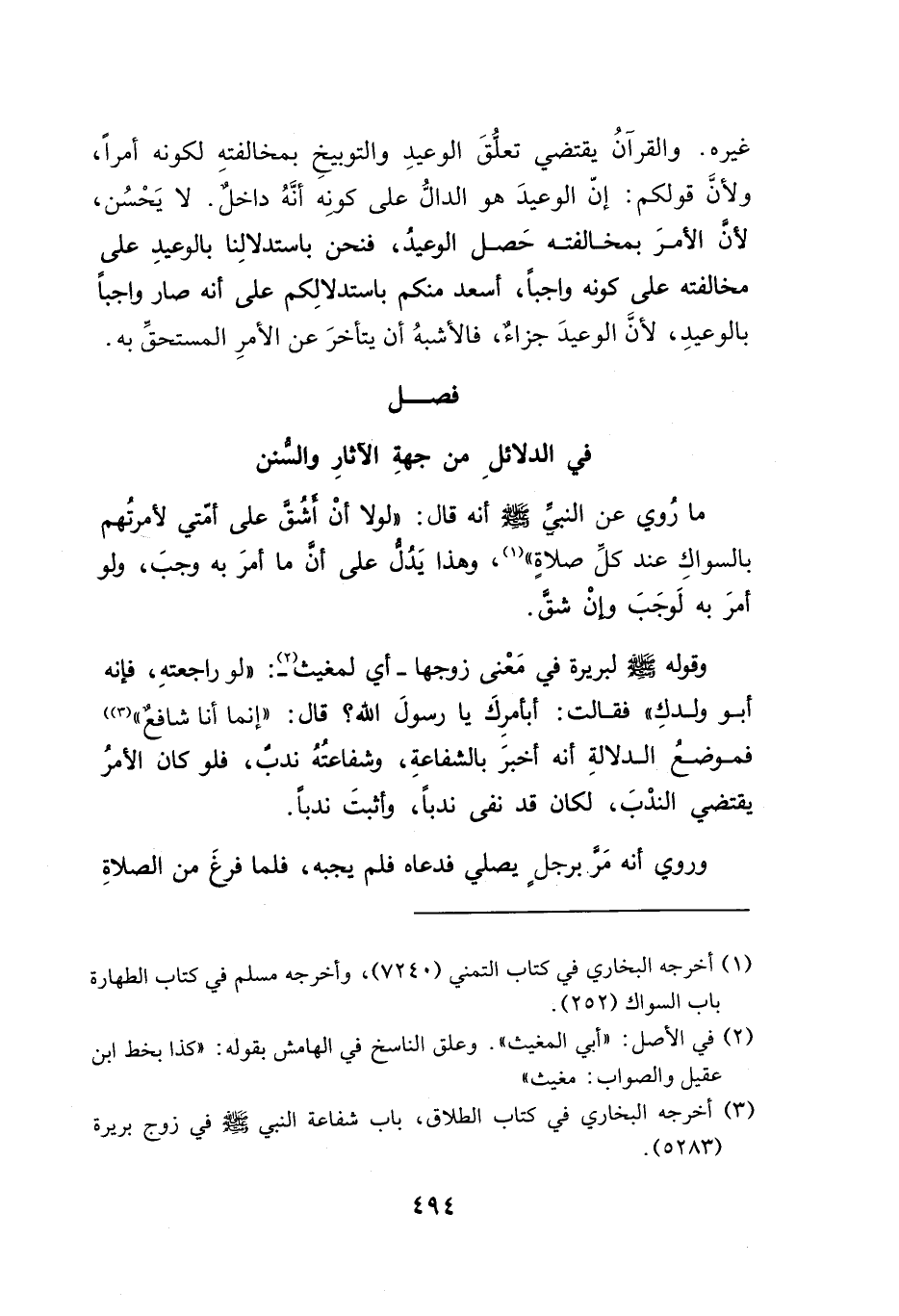 وقوله صلى الله عليه وسلم لبريرة في مَعْنى زوجها -أي لمغيث (٢) -: "لو راجعتهِ، فإنه أبو ولدكِ" فقالت: أبأمرِكَ يا رسولَ الله؟ قال: "إنما أنا شافعٌ" (٣) فموضع الدلالةِ أنه أخبرَ بالشفاعةِ، وشفاعتُهُ ندب، فلو كان الأمرُ يقتضي الندْبَ، لكان قد نفى ندباً، وأثبتَ ندباً.