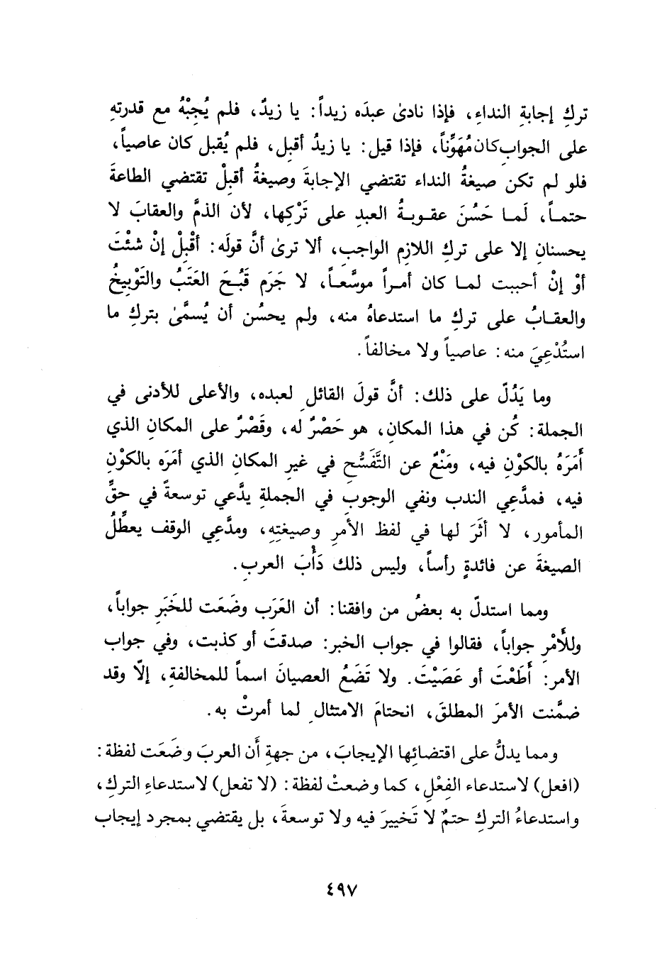 تركِ إجابةِ النداءِ، فإذا نادى عبدَه زيداً: يا زيدٌ، فلم يُجبْهُ مع قدرتهِ على الجواب كان مُهَوناً، فإذا قيل: يا زيدُ أقبِل، فلم يُقبلَ كان عاصياً، فلو لم تكنَ صيغةُ النداء تقتضي الإجابةَ وصيغةُ أقبِلْ تقتضي الطاعةَ حتماً، لَما حَسُنَ عقوبةُ العبدِ على تَرْكِها، لأن الذم والعقابَ لا يحسنانِ إلا على تركِ اللازِم الواجب، ألا ترى أن قولَه: أقْبِلْ إنْ شئْتَ أوْ إنْ أحببت لما كان أمراً موسعَاً، لا جَرَم قَبُحَ العَتَبُ والتَوْيِيخُ والعقابُ على تركِ ما استدعاهُ منه، ولم يحسُن أن يُسمَّى بتركِ ما استُدْعِيَ منه: عاصياً ولا مخالفاً.