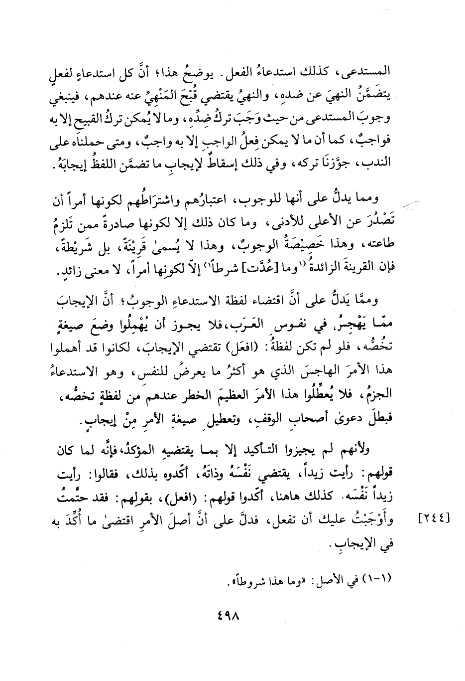 وممَّا يَدلُ على أنَّ اقتضاء لفظة الاستدعاءِ الوجوبُ؛ أنَ الإيجابَ مما يَهْجِسُ، في نفوس العَرَب، فلايجوزأن يْهْمِلُوا وضعَ صيغةٍ تخُصه، فلو لى تكن لفظةُ: (فعَل) تقتضي الإيجابَ، لكانوا قد أهملوا هذا الأمرَ الهاجسَ الذي هو أكثرُ ما يعرضُ للنفسِ، وهو الاستدعاءُ الجزمُ، فلا يُعطلُوا هذا الأمرَ العظيمَ الخطر عندهم من لفظةٍ تخضُه، فبطلَ دعوى أصحابِ الوقفِ، وتعطيلِ صيغةِ الأمرِ مِنْ إيجابٍ.