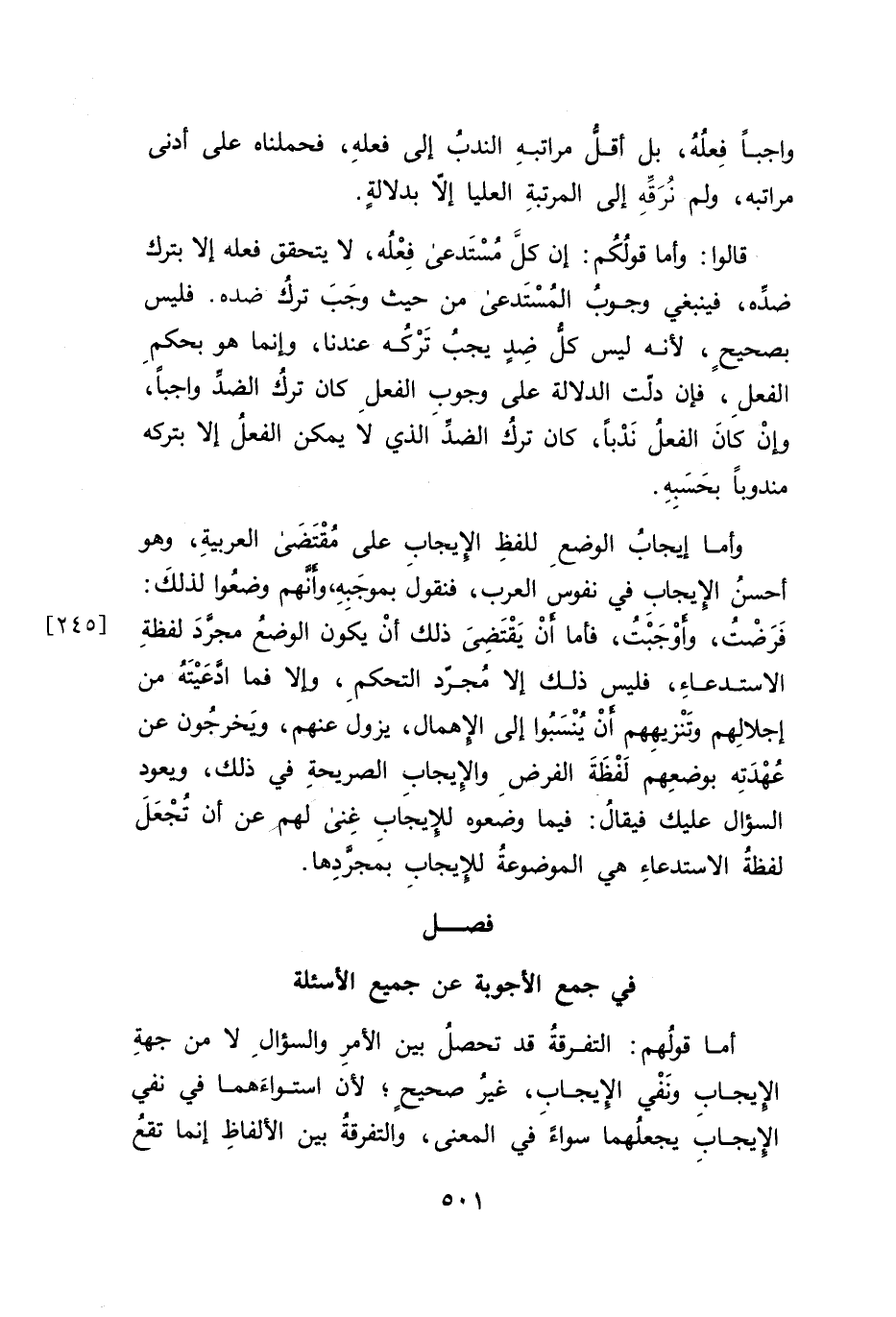 أما قولُهم: التفرقةُ قد تحصلُ بين الأمرِ والسؤالِ لا من جهةِ الإيجابِ ونَفْي الإيجاب، غير صحيح؛ لأن استواءَهما في نفي الإيجابِ يجعلُهما سواءً في المعنى، والتفرقةُ بين الألفاظِ إنما تقعُ