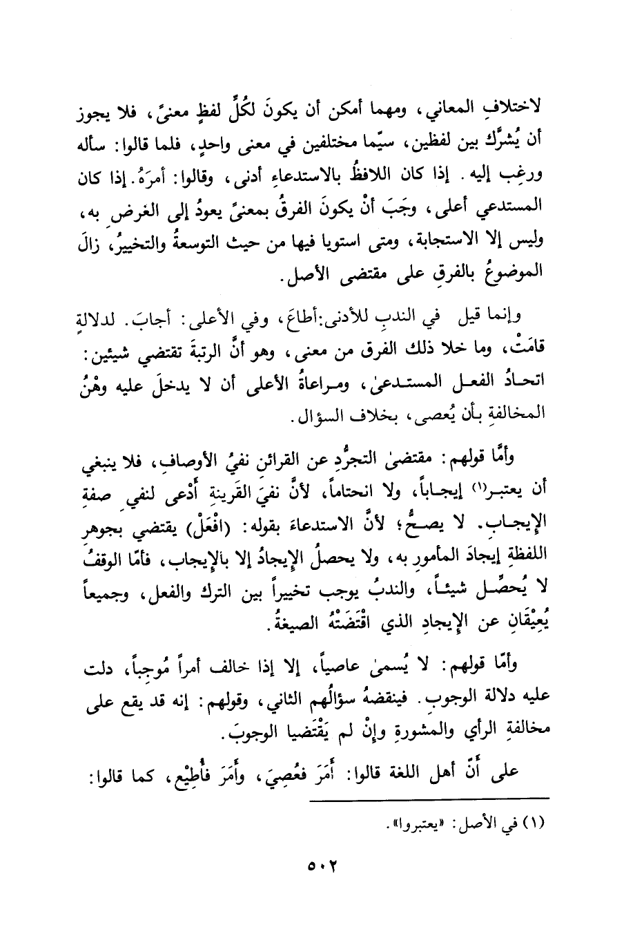 لاختلافِ المعاني، ومهما أمكن أن يكونَ لكُلِّ لفظٍ معنىً، فلا يجوز أن يُشرك بين لفظين، سيّما مختلفين في معنى واحدٍ، فلما قالوا: سأله ورغِب إليه. إذا كان اللافظُ بالاستدعاءِ أدنى، وقالوا: أمرَهُ. إذا كان المستدعي أعلى، وجَبَ أنْ يكونَ الفرقُ بمعنىً يعودُ إلى الغرضِ به، وليس إلا الاستجابة، ومتى استويا فيها من حيث التوسعةُ والتخييرُ، زالَ الموضوعُ بالفرقِ على مقتضى الأصل.