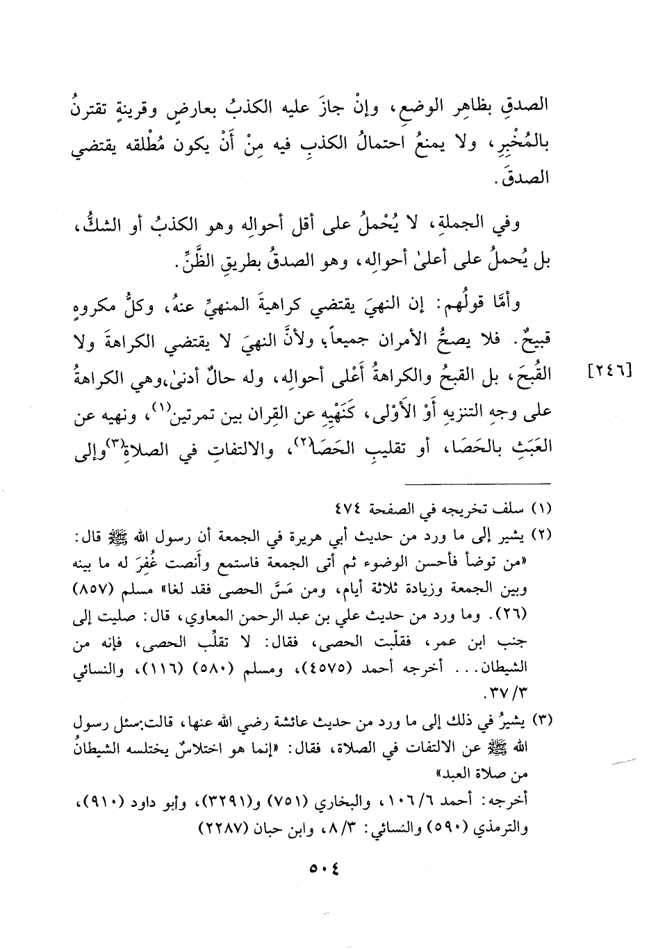 وأمَّا قولُهم: إن النهيَ يقتضي كراهيةَ المنهي عنهُ، وكل مكروهٍ قبيحٌ. فلا يصحُّ الأمران جميعاً؛ ولأن النهيَ لا يقتضي الكراهةَ ولا القُبحَ، بل القبحُ والكراهةُ أَعْلى أحوالِه، وله حالٌ أدنى، وهي الكراهةُ على وجهِ التنزيهِ أَوْ الأَوْلى، كَنَهْيِهِ عن القِران بين تمرتين (١)، ونهيه عن العَبَثِ بالحَصَا، أو تقليبِ الحَصَا (٢)، والالتفاتِ في الصلاةِ (٣) وإلى
