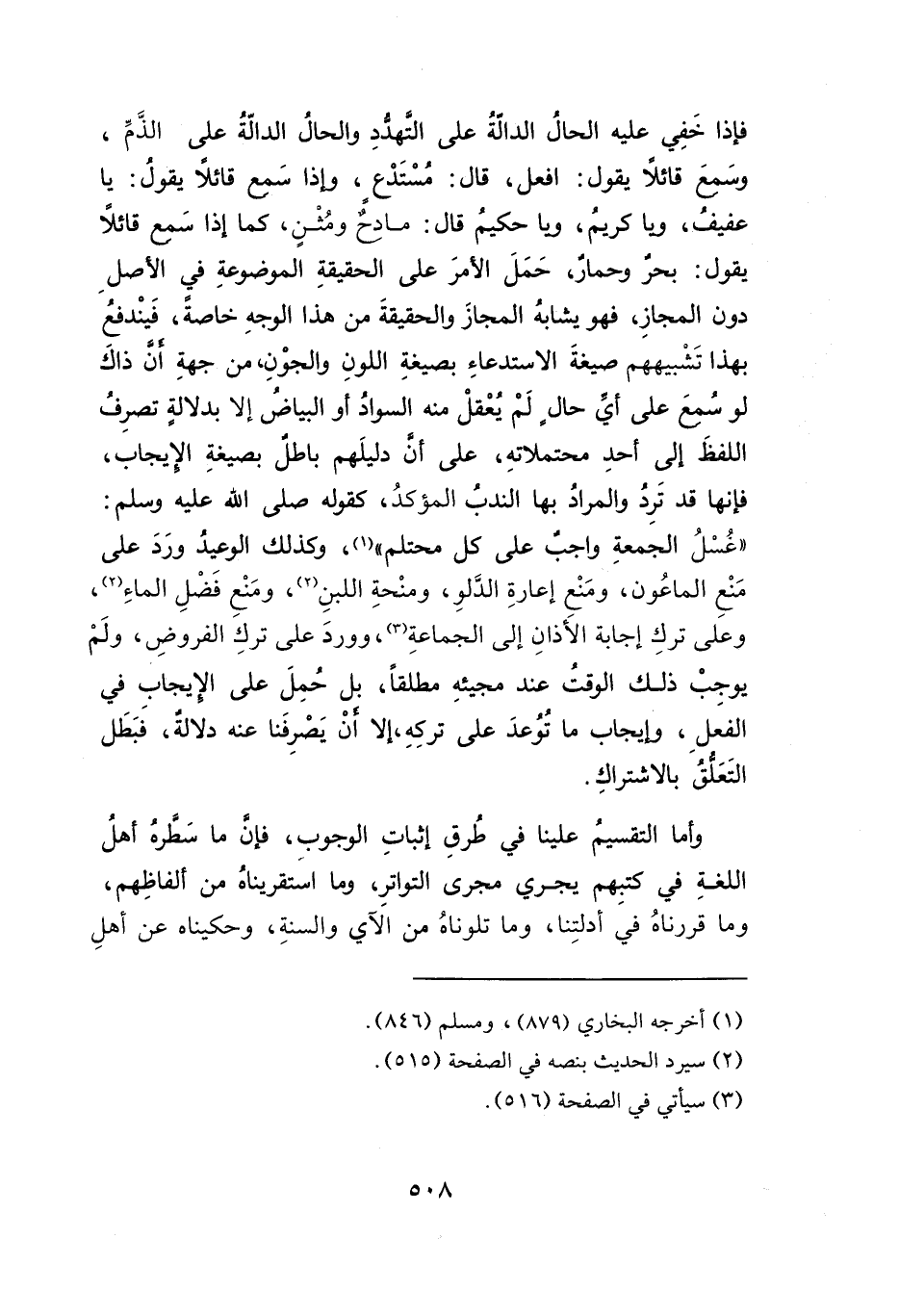 فإذا خَفِي عليه الحالُ الدالّه على التَّهدُّد والحالُ الدالّةُ على الذَّمِّ، وسَمعَ قائلًا يقول: افعل، قال: مستدع، وإذا سَمع قائلًا يقول: يا عفيفُ، ويا كريمُ، ويا حكيمُ قال: مادحٌ ومُثْنٍ، كما إذا سَمع قائلًا يقول: بحرٌ وحمارٌ، حَمَلَ الأمرَ على الحقيقةِ الموضوعةِ فيٍ الأصلِ دون المجازِ، فهو يشابهُ المجازَ والحقيقةَ من هذا الوجهِ خاصة، فَينْدفعُ بهذا تَشْبيههم صيغةَ الاستدعاءِ بصيغةِ اللونِ والجوْنِ، من جهةِ أن ذاكَ لو سُمعَ على أيَ حالٍ لَمْ يُعْقلْ منه السوادُ أو البياضُ إلا بدلالةٍ تصرِفُ اللفظَ إلى أحدِ محتملاتهِ، على أن دليلَهم باطلٌ بصيغةِ الايجاب، فإنها قد تَرِدُ والمرادُ بها الندب المؤكدُ، كقوله صلى الله عليه وسلم: "غُسْلُ الجمعةِ واجبٌ على كلُّ محتلم" (١)، وكذلك الوعيدُ ورَدَ على مَنْعِ الماعُون، ومَنْع إعارةِ الدلوِ، ومنْحةِ اللبنِ (٢)، ومَنْعِ فَضْلِ الماءِ (٢)، وعلى تركِ إجابة الأَذانِ إلى الجماعةِ (٣)، ووردَ على تركِ الفروضِ، ولَمْ يوجِبْ ذلك الوقتُ عند مجيئهِ مطلقاً، بل حُملَ على الايجاب في الفعلِ، وإيجاب ما تُوُعدَ على تركِهِ، إلا أنْ يَصرِفَنا عنه دلالةٌ، فَبَطَل التَعَلُّق بالاشتراكِ.