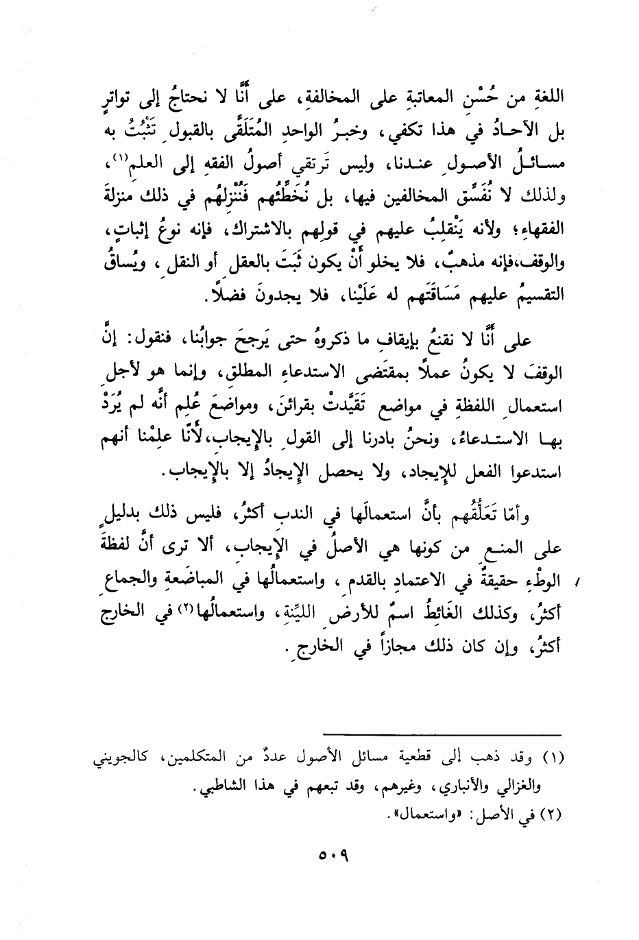 اللغةِ من حُسْنِ المعاتبةِ على المخالفةِ، على أنا لا نحتاجُ إلى تواترٍ بل الأحادُ في هذا تكفي، وخبرُ الواحدِ المُتَلَقى بالقبولِ تَثبُتُ به مسائلُ الأصولِ عندنا، وليس تَرتقي أصولُ الفقهِ إلى العلمِ (١)، ولذلك لا نُفَسق المخالفين فيها، بل نُخَطئُهم فَنُنْزِلهم في ذلك منزلةَ الفقهاءِ؛ ولأنه يَنْقلِبُ عليهم في قولِهم بالاشتراك، فإنه نوعُ إثباتٍ، والوقف، فإنه مذهبٌ، فلا يخلو أنْ يكون ثَبَتَ بالعقلِ أو النقلِ، ويُساقُ التقسيمُ عليهم مَسَاقَتَهم له عَلَيْنا، فلا يجدونَ فضلاً.