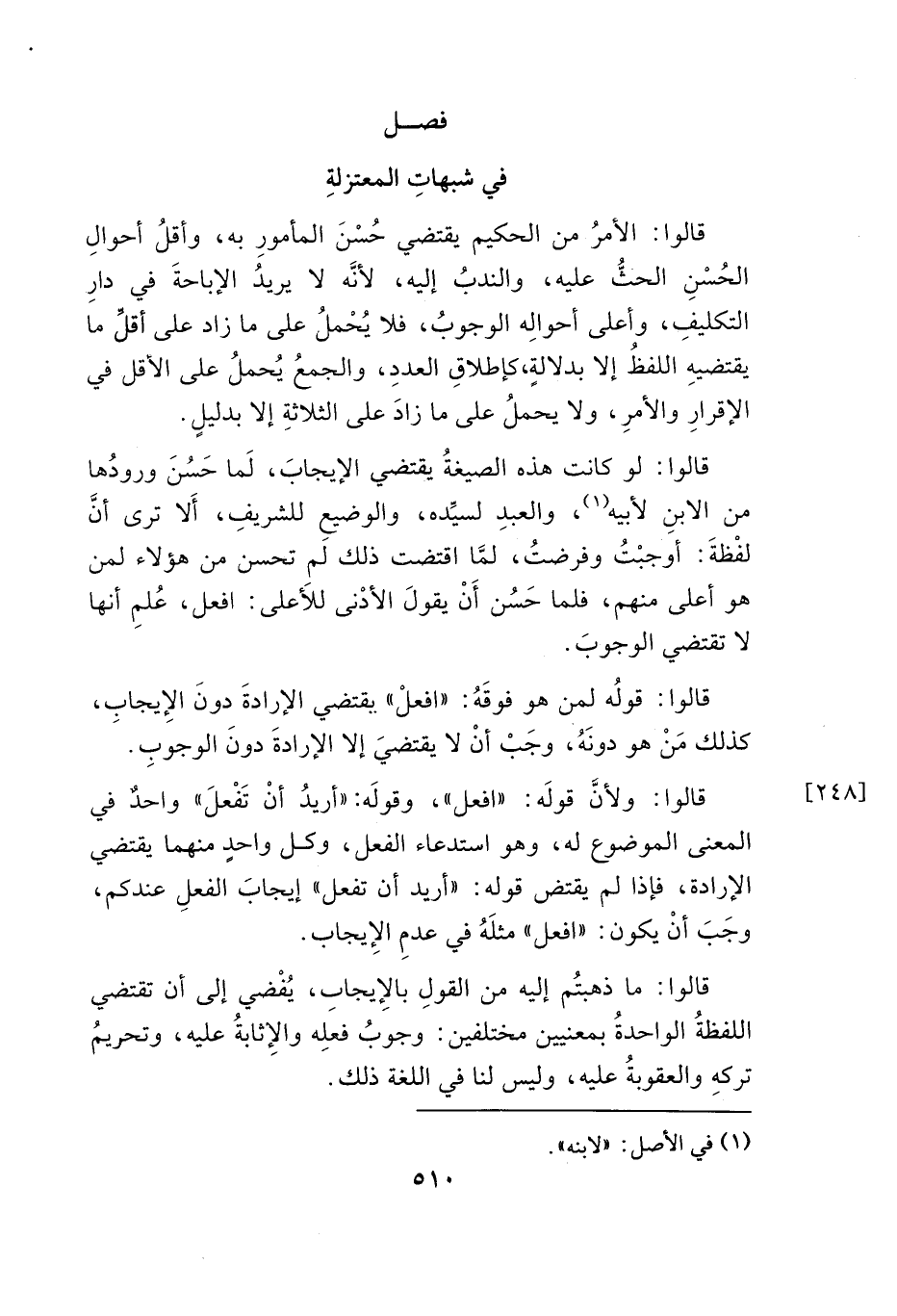 قالوا: لو كانت هذه الصيغةُ يقتضي الإيجابَ، لَما حَسُنَ ورودُها من الابنِ لأبيه (١)، والعبدِ لسيِّده، والوضيعِ للشريفِ، أَلا ترى أنَ لفْظةَ: أوجبْتُ وفرضتُ، لمَّا اقتضت ذلك لم تحسن من هؤلاء لمن هو أعلى منهم، فلما حَسُن أَنْ يقولَ الأدْنى للأَعلى: افعل، عُلمِ أنها لا تقتضي الوجوبَ.