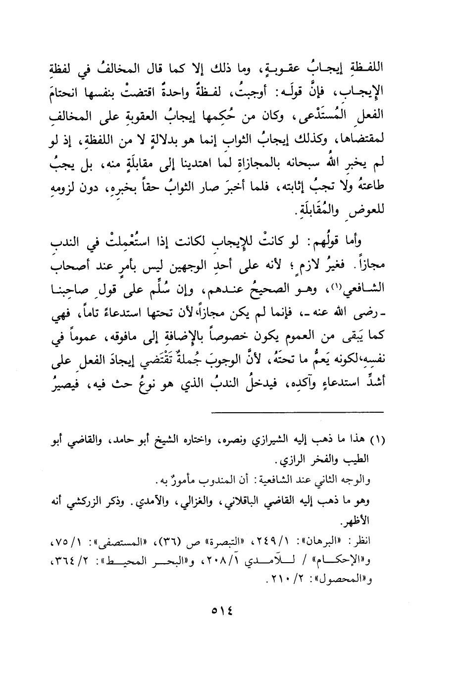وأما قولُهم: لو كانت للِإيجاب لكانت إذا استعْمِلتْ في الندبِ مجازاً. فغير لازمٍ؛ لأنه على أحدِ الوجهين ليس بأمرٍ عند أصحاب الشافعي (١)، وهو الصحيح عندهم، وإن سلِّم على قولِ صاحِبنا -رضى الله عنه-، فإنما لم يكن مجازاً، لأن تحتها استدعاءً تاماً، فهي كما يَبقى من العموم يكون خصوصاً بالإضافةِ إلى مافوقه، عموماً في نفسِهِ، لكونه يَعمُّ ما تحتَة، لأنَّ الوجوبَ جُملة تَقْتَضي إيجادَ الفعلِ على أشدِّ استدعاءٍ وآكدِه، فيدخل الندب الذي هو نوع حث فيه، فيصير