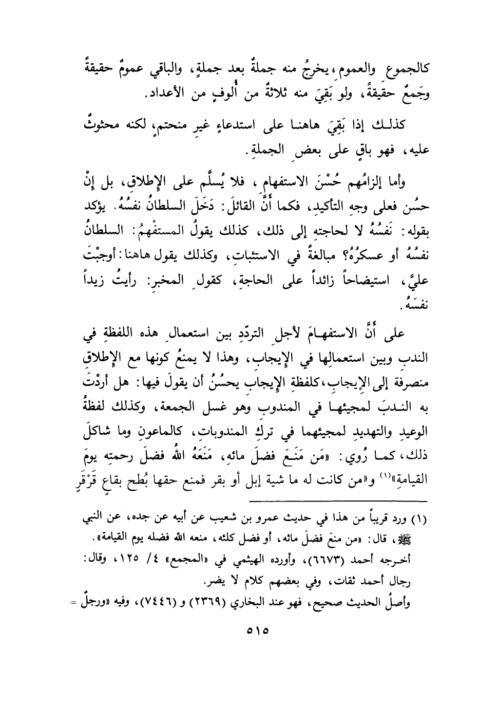 على أنَ الاستفهامَ لأجلِ التردّدِ بين استعمالِ هذه اللفظةِ في الندب وبين استعمالِها في الِإيجابِ، وهذا لا يمنعُ كونها مع الإِطلاقِ منصرفَة إلى الإِيجابِ، كلفظةِ الإِيجابِ يحسُنُ أن يقولَ فيها: هل أردْتَ به الندبَ لمجيئها في المندوب وهو غسل الجمعة، وكذلك لفظةُ الوعيدِ والتهديدِ لمجيئهما في تركِ المندوباتِ، كالماعونِ وما شاكلَ ذلك، كما رُوي: "مَن مَنَعَ فضلَ مائهِ، مَنَعَهُ اللهُ فضلَ رحمتِه يومَ القيامةِ" (١) و"من كانت له ما شية إبل أو بقر فمنع حقها بُطح بقاعٍ قَرْقَرٍ