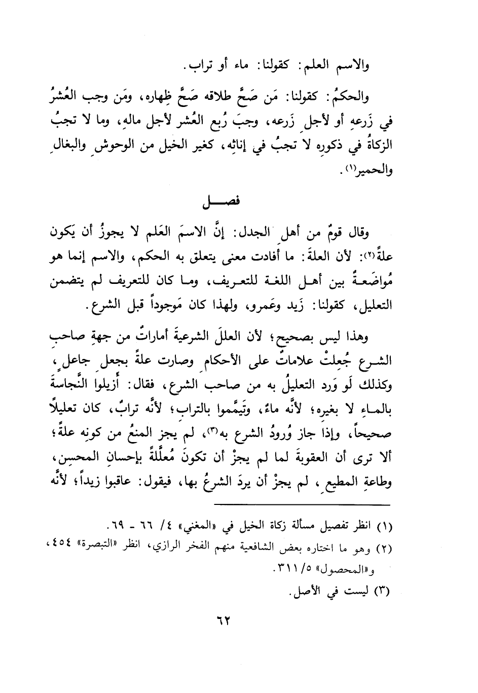 وقال قوم من أهلِ الجدل: إنَّ الاسمَ العَلم لا يجوزُ أن يَكون علةً (٢): لأن العلَّةَ: ما أفادت معنى يتعلق به الحكم، والاسم إنما هو مُواضَعةٌ بين أهل اللغة للتعريف، وما كان للتعريف لم يتضمن التعليل، كقولنا: زَيد وعَمرو، ولهذا كان مَوجوداً قبل الشرع.