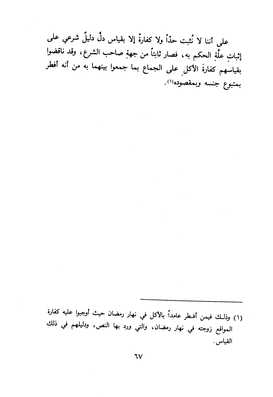 على أننا لا نُثبت حداً ولا كفارة إلا بقياس دل دليل شرعي على إثباتِ علةِ الحكم به، فصار ثابتاً من جهةِ صاحب الشرع، وقد ناقضوا بقياسهم كفارةَ الأكلِ على الجماع بما جمعوا بينهما به من أنه أفطر بمتبوع جنسه وبمقصوده (١).