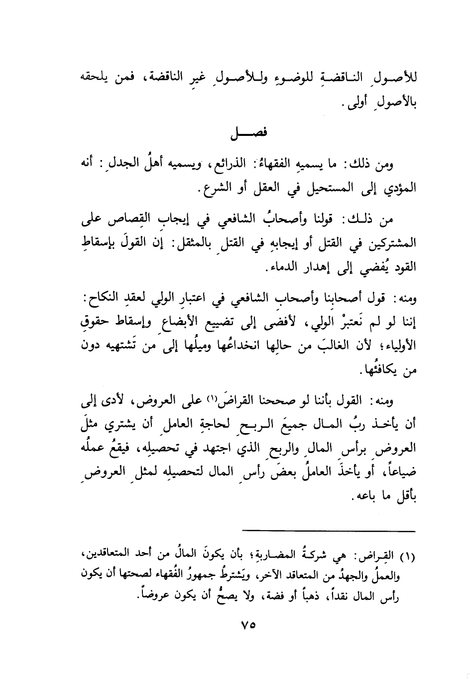 (١) القِراض: هي شركةُ المضاربةِ؛ بأن يكونَ المالى من أحد المتعاقدين، والعملُ والجهدُ من المتعاقد الآخر، وَيشترطُ جمهور الفُقهاء لصحتها أن يكون رأس المال نقداً، ذهباً أو فضة، ولا يصح أن يكون عروضاً.