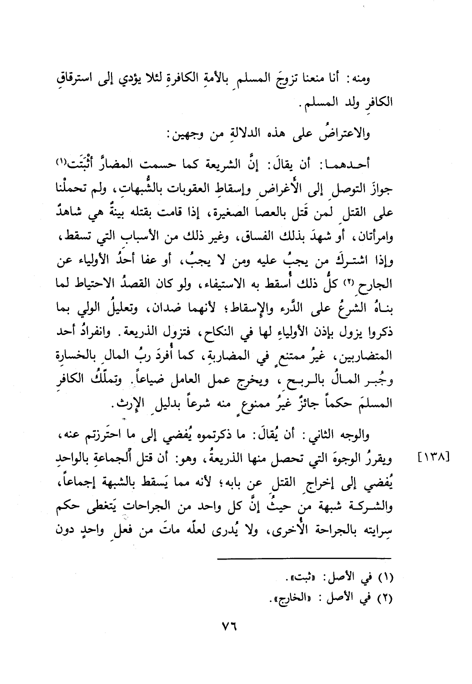 أحدهما: أن يقالَ: إن الشريعة كما حسمت المضار أثْبَتَت (١) جوازَ التوصلِ إلى الأغراضِ وإسقاطِ العقوبات بالشبهاتِ، ولم تحملْنا على القتلِ لمن قَتل بالعصا الصغيرة، إذا قامت بقتله بينة هي شاهد وامرأتان، أو شهدَ بذلك الفساق، وغير ذلك من الأسباب التي تسقط، وإذا اشتركَ من يجبُ عليه ومن لا يجبُ، أو عفا أحدُ الأولياء عن الجارحِ (٢) كلُّ ذلك أُسقط به الاستيفاء، ولو كان القصدُ الاحتياط لما بناهُ الشرعُ على الدَّرء والِإسقاط؛ لأنهما ضدان، وتعليلُ الولي بما ذكروا يزول بإذن الأولياءِ لها في النكاح، فتزول الذريعة. وانفرادُ أحد المتضاربين، غيرُ ممتنعٍ في المضاربةِ، كما أفردَ ربُ المالِ بالخسارِة وجُبر المالُ بالربحِ، ويخرج عمل العامل ضياعاً. وتملكُ الكافرِ المسلمَ حكماً جائز غيرُ ممنوعٍ منه شرعاً بدليلِ الإرثِ.