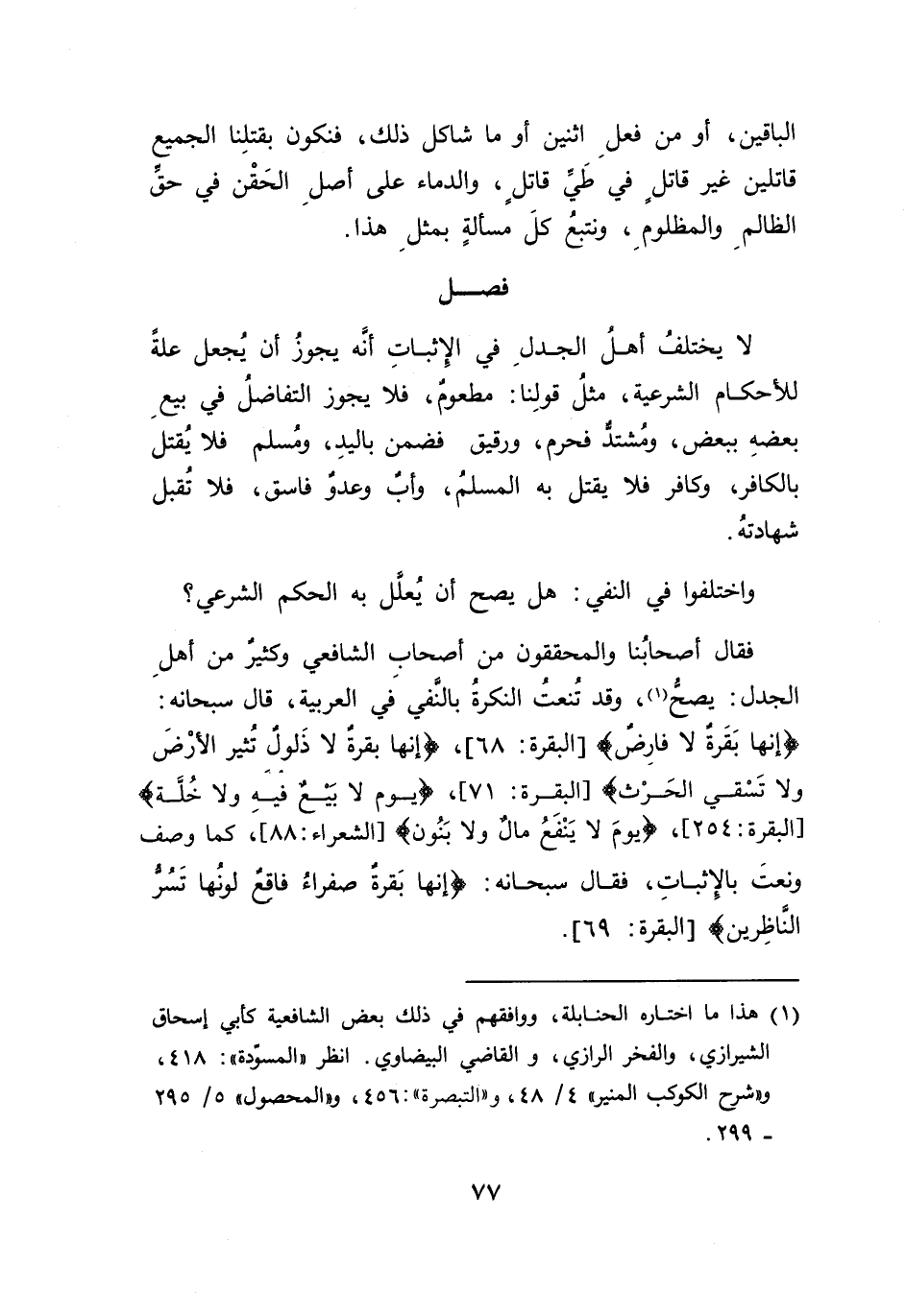 واختلفوا في النفي: هل يصح أن يُعلل به الحكم الشرعي؟ فقال أصحابُنا والمحققون من أصحاب الشافعي وكثيرٌ من أهلِ الجدل: يصحُّ (١)، وقد تُنعتُ النكرةُ بالنَفي فَي العربية، قال سبحانه: {إنها بَقَرةٌ لا فارِضٌ} [البقرة: ٦٨] {إِنَّهَا بَقَرَةٌ لَا ذَلُولٌ تُثِيرُ الْأَرْضَ وَلَا تَسْقِي الْحَرْثَ} [البقرة: ٧١]، {يَوْمٌ لَا بَيْعٌ فِيهِ وَلَا خُلَّةٌ} [البقرة: ٢٥٤]، {يَوْمَ لَا يَنْفَعُ مَالٌ وَلَا بَنُونَ} [الشعراء: ٨٨]،، كما وصف ونعتَ بالإثباتِ، فقال سبحانه: {إِنَّهَا بَقَرَةٌ صَفْرَاءُ فَاقِعٌ لَوْنُهَا تَسُرُّ النَّاظِرِينَ} [البقرة: ٦٩].